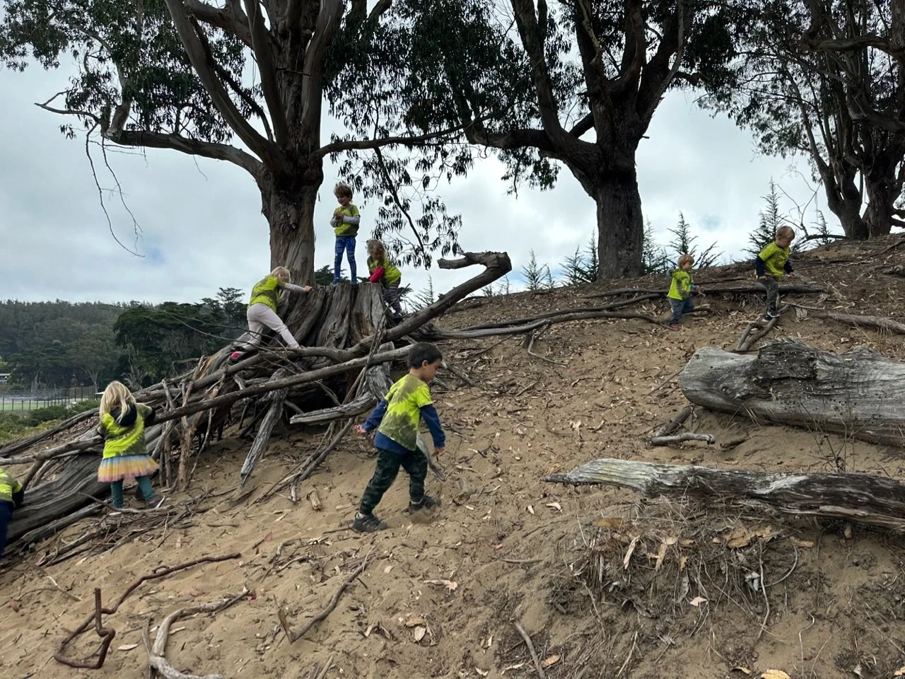 We love to explore the Presidio usually starting from the Inspiration Point parking lot, or the lot at Paul Goode Field. We often end up in the nature space just east of Inspiration Point where there is a sandy area with lots of climbing trees for all levels. We also will often hike to the spire and check out the surrounding areas or to Woodline (lovers lane) to walk the line. El Polin Spring is another great spot to play in the water and we love to play hide and seek in the low bushes and trees.