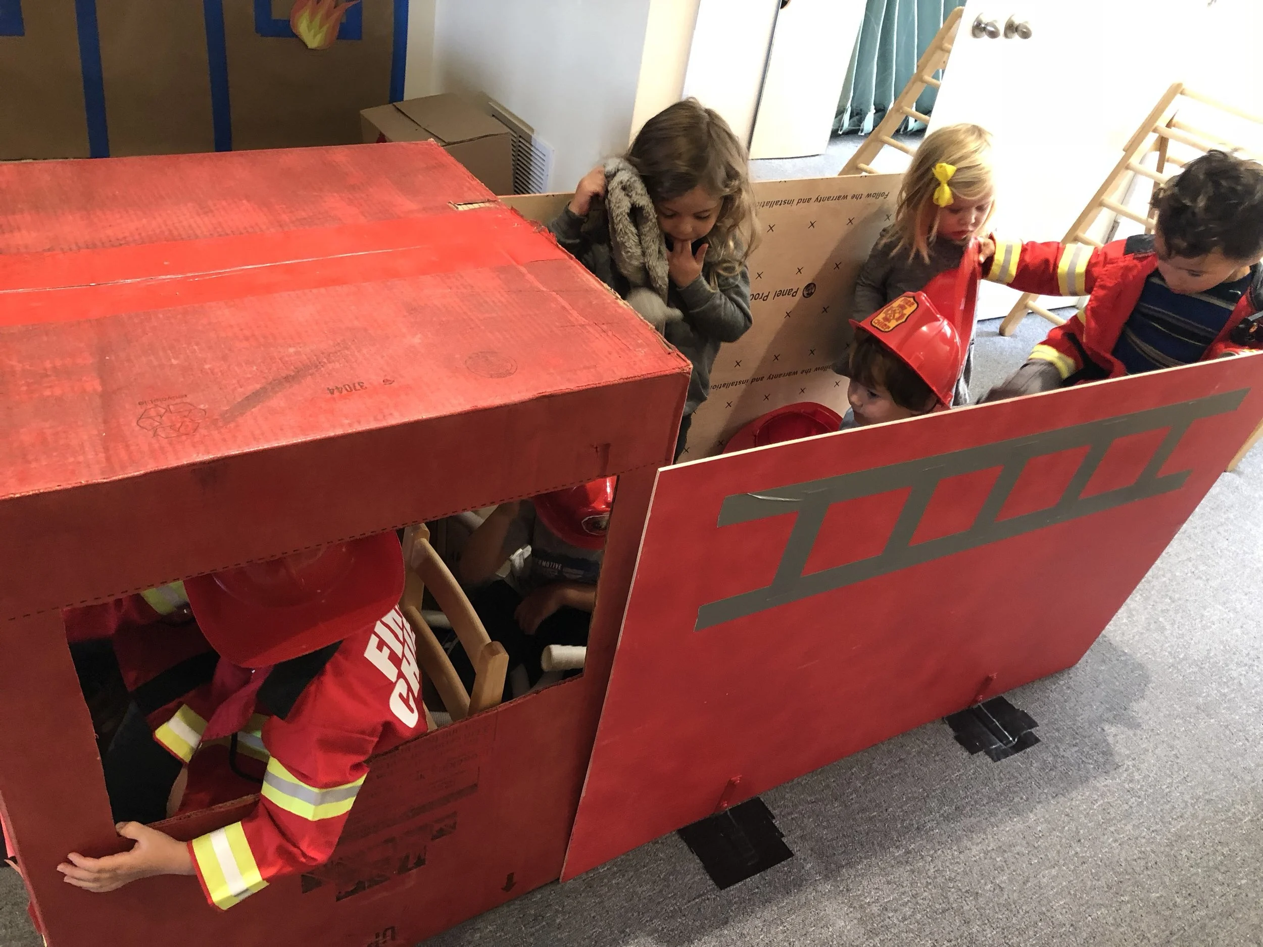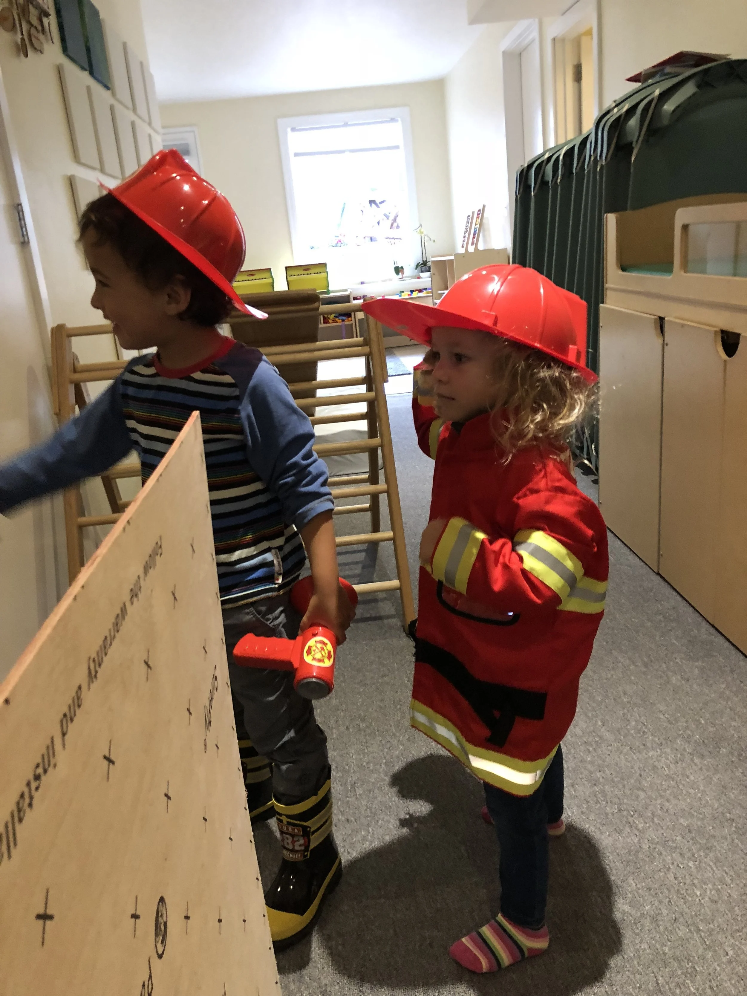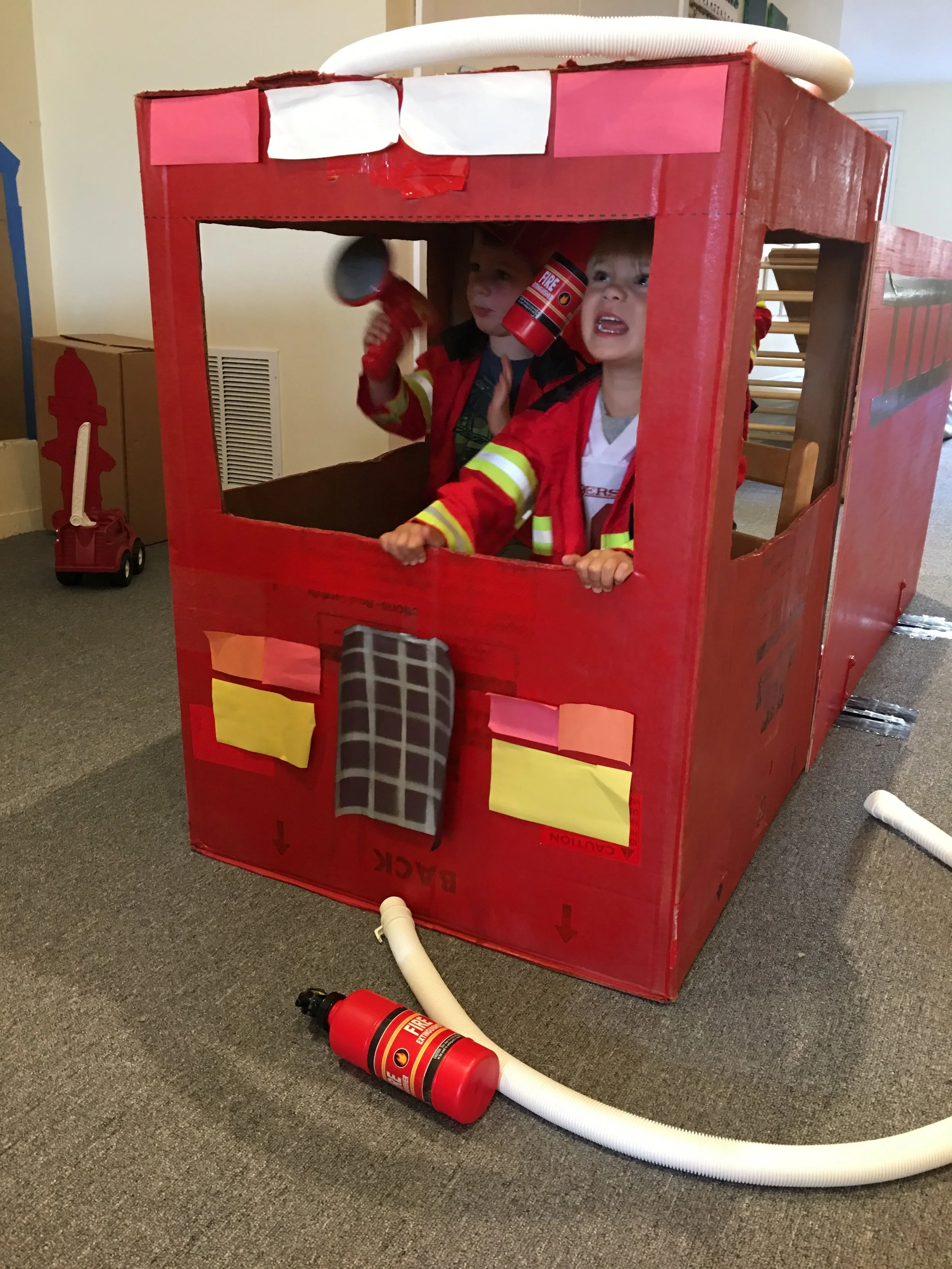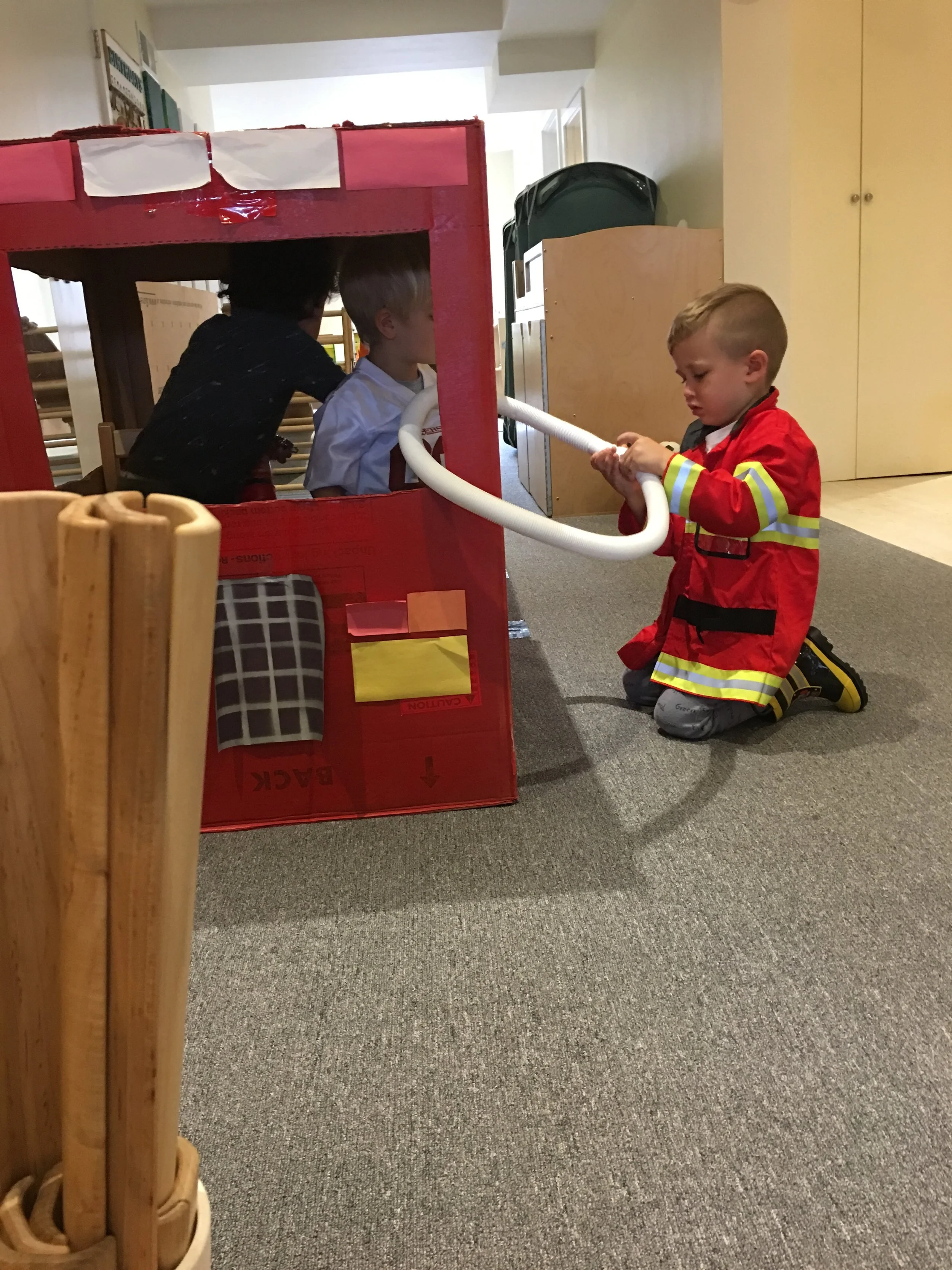 In our time outside, we have created beds using the green mats and invited our friends over for a sleepover. Sometimes, we like to pretend the mats our tortillas and we wrap our friends inside to create yummy burritos. Another huge highlight of our outdoor play is Monster Friday! We love running away from daddy monsters and playing Hide and Go Seek. Friends have turned into monsters too! We also had an adventure to the fire station, where we saw fire trucks and fire engines. We even got to see the oxygen tanks and masks that firefighters use, as well as other equipment like saws. Our trip to the fire station has inspired a lot of our play. We like to connect the pipes together to pretend they are hoses as we spray away anything and everything that catches on fire and build a fire station using the blocks.