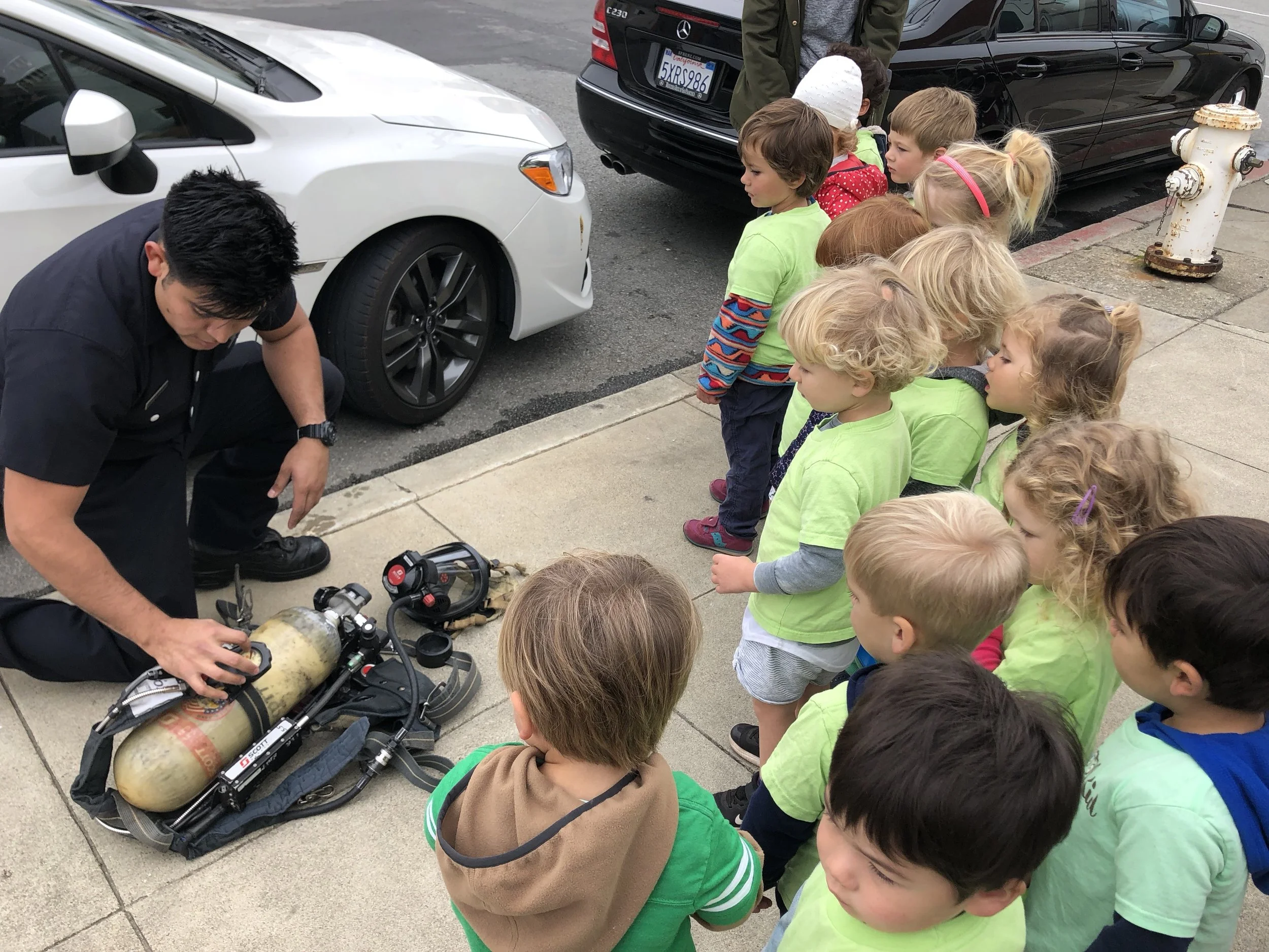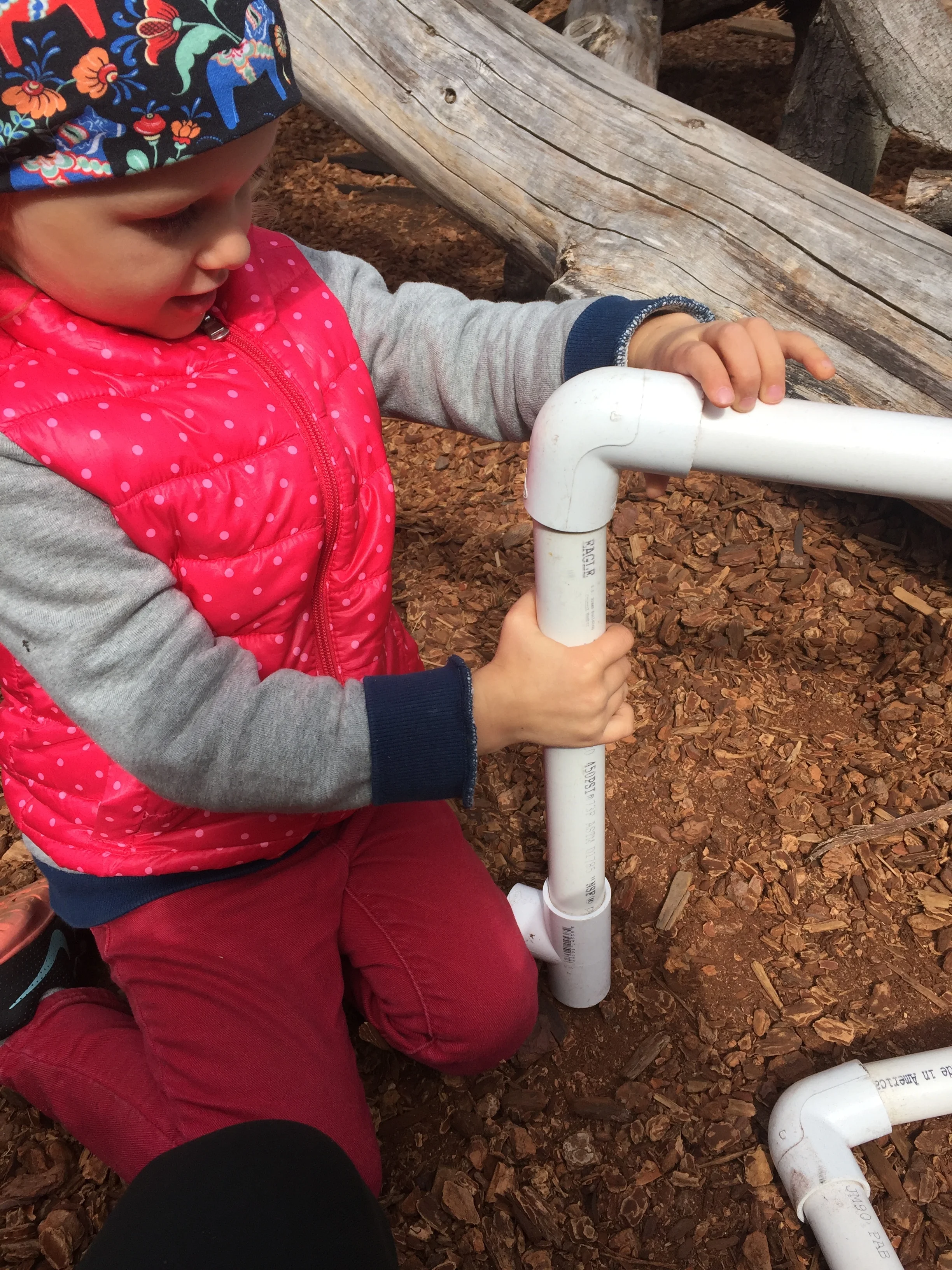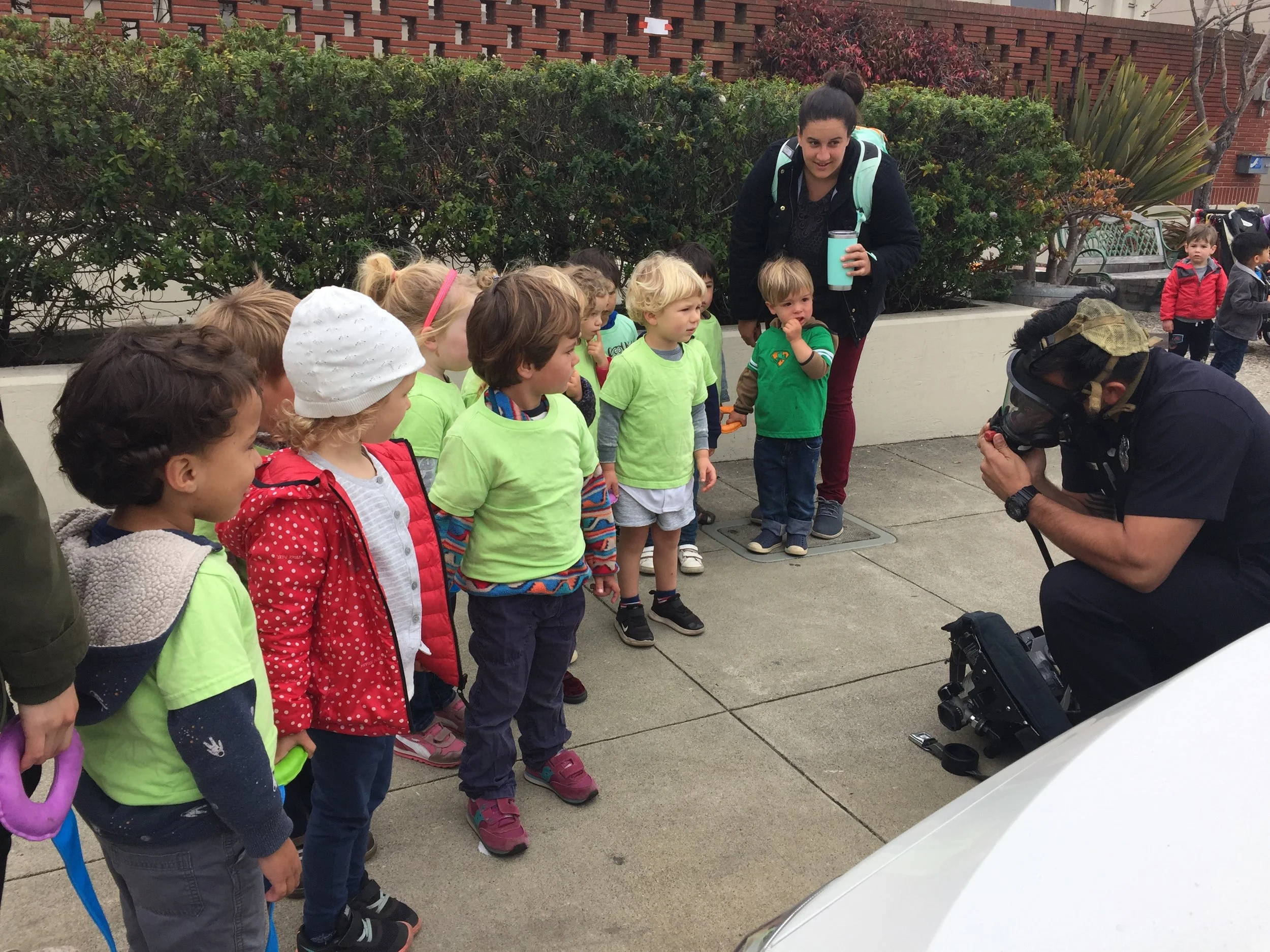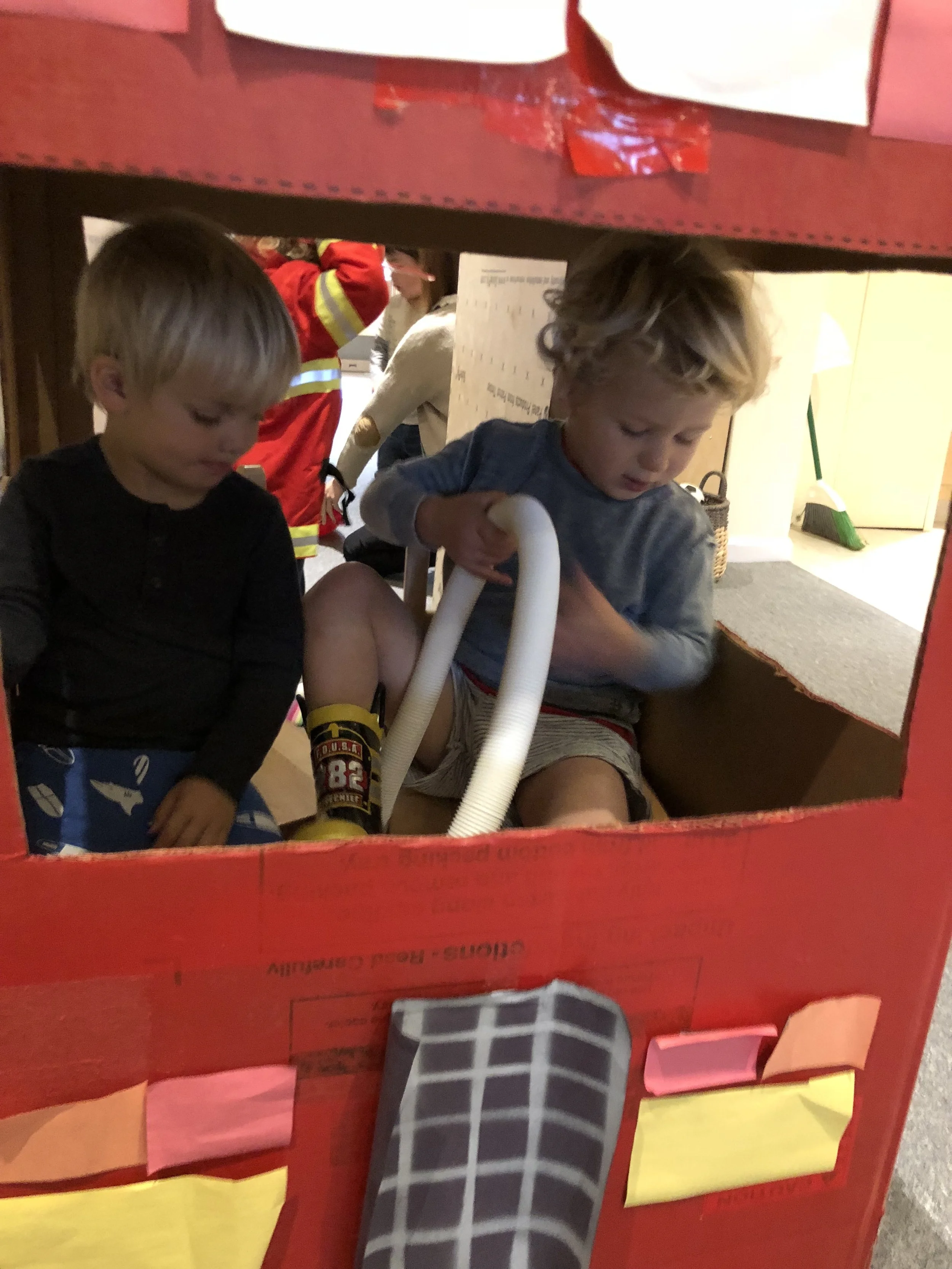 In our time outside, we have created beds using the green mats and invited our friends over for a sleepover. Sometimes, we like to pretend the mats our tortillas and we wrap our friends inside to create yummy burritos. Another huge highlight of our outdoor play is Monster Friday! We love running away from daddy monsters and playing Hide and Go Seek. Friends have turned into monsters too! We also had an adventure to the fire station, where we saw fire trucks and fire engines. We even got to see the oxygen tanks and masks that firefighters use, as well as other equipment like saws. Our trip to the fire station has inspired a lot of our play. We like to connect the pipes together to pretend they are hoses as we spray away anything and everything that catches on fire and build a fire station using the blocks.