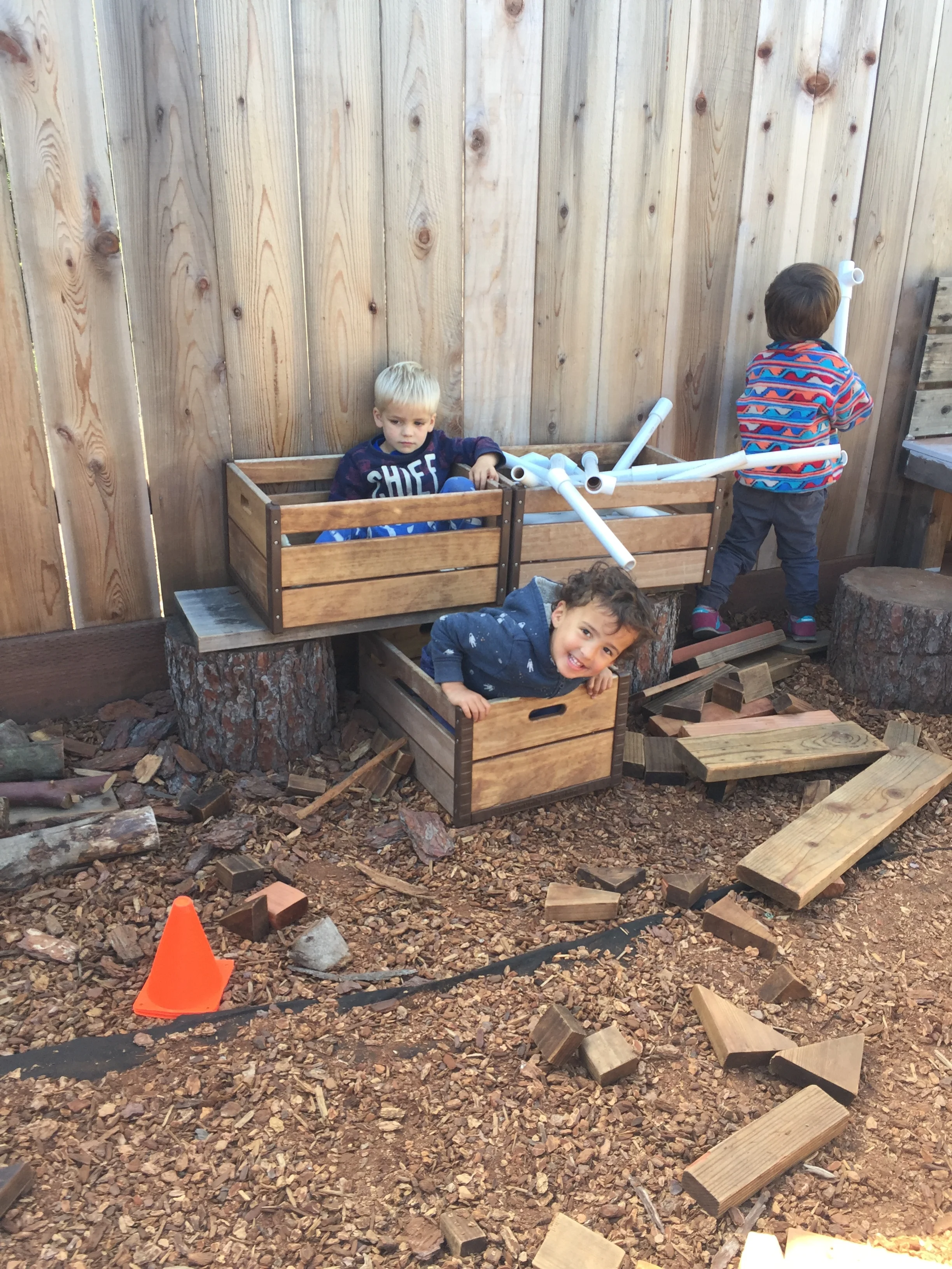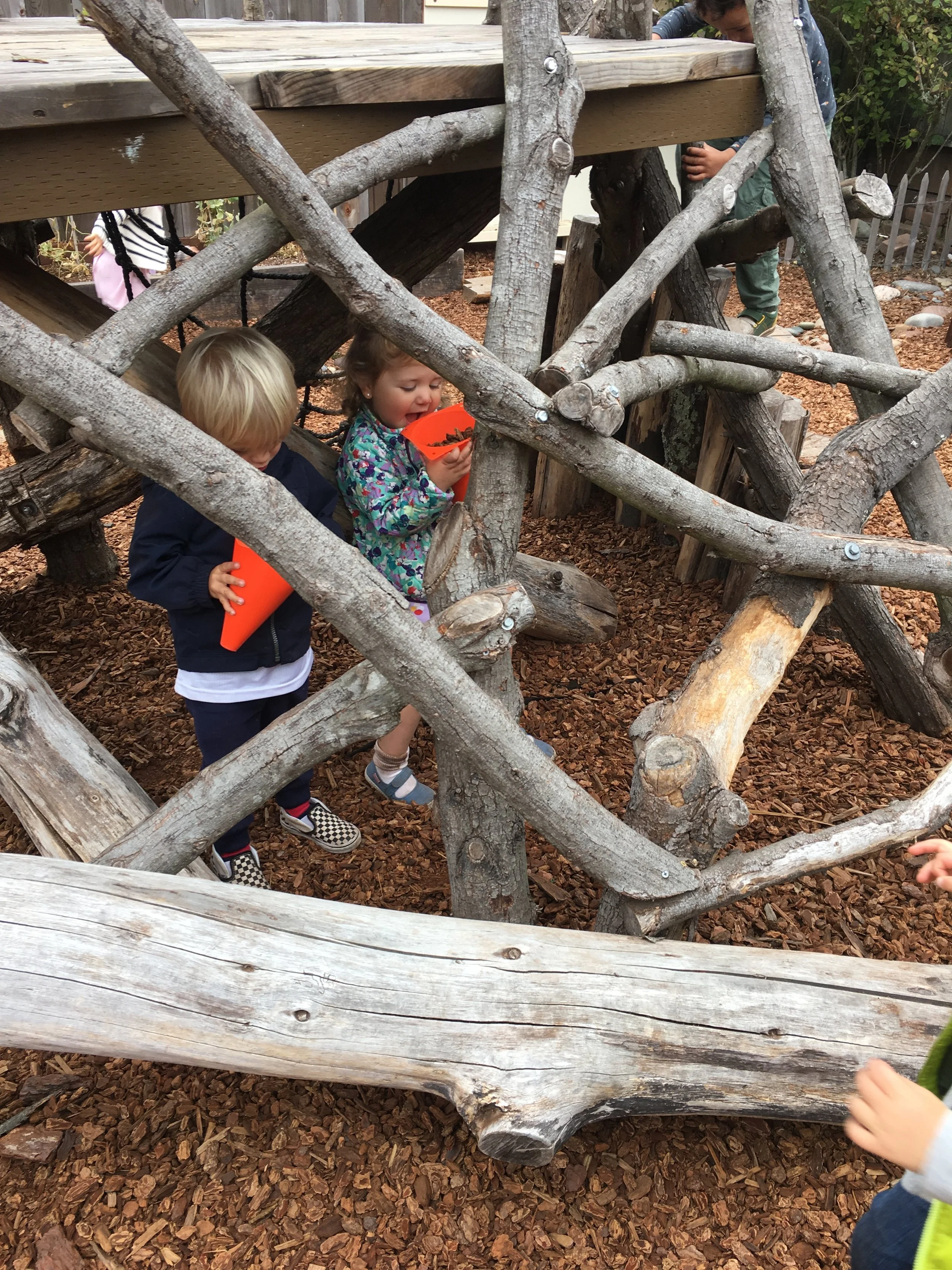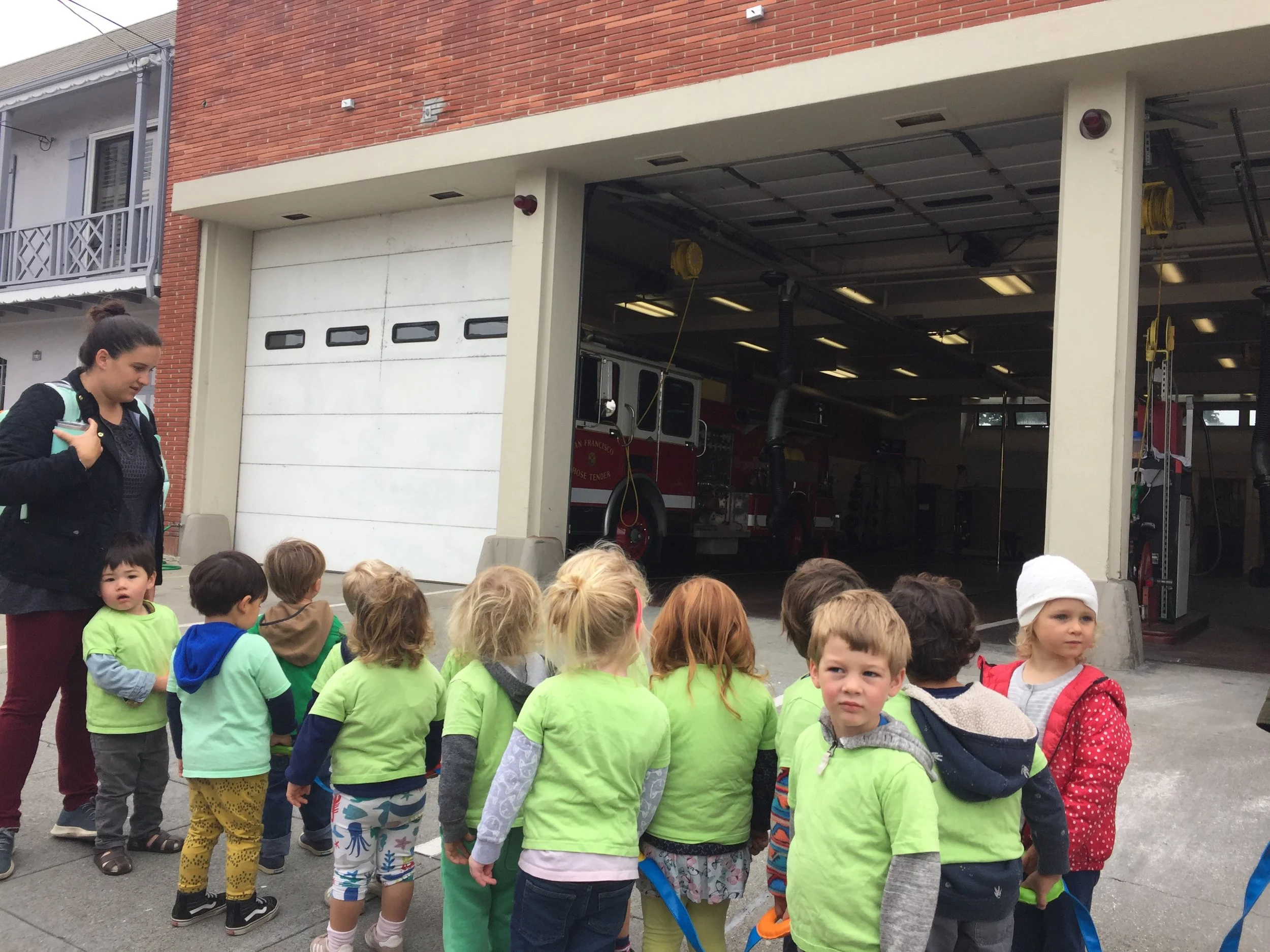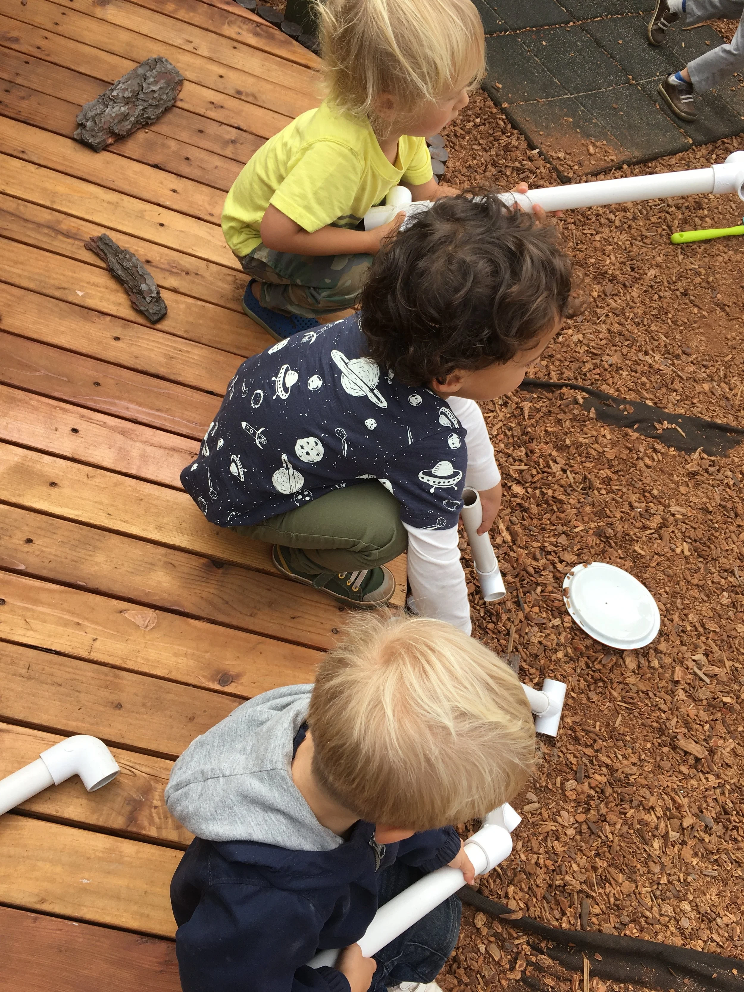 In our time outside, we have created beds using the green mats and invited our friends over for a sleepover. Sometimes, we like to pretend the mats our tortillas and we wrap our friends inside to create yummy burritos. Another huge highlight of our outdoor play is Monster Friday! We love running away from daddy monsters and playing Hide and Go Seek. Friends have turned into monsters too! We also had an adventure to the fire station, where we saw fire trucks and fire engines. We even got to see the oxygen tanks and masks that firefighters use, as well as other equipment like saws. Our trip to the fire station has inspired a lot of our play. We like to connect the pipes together to pretend they are hoses as we spray away anything and everything that catches on fire and build a fire station using the blocks.