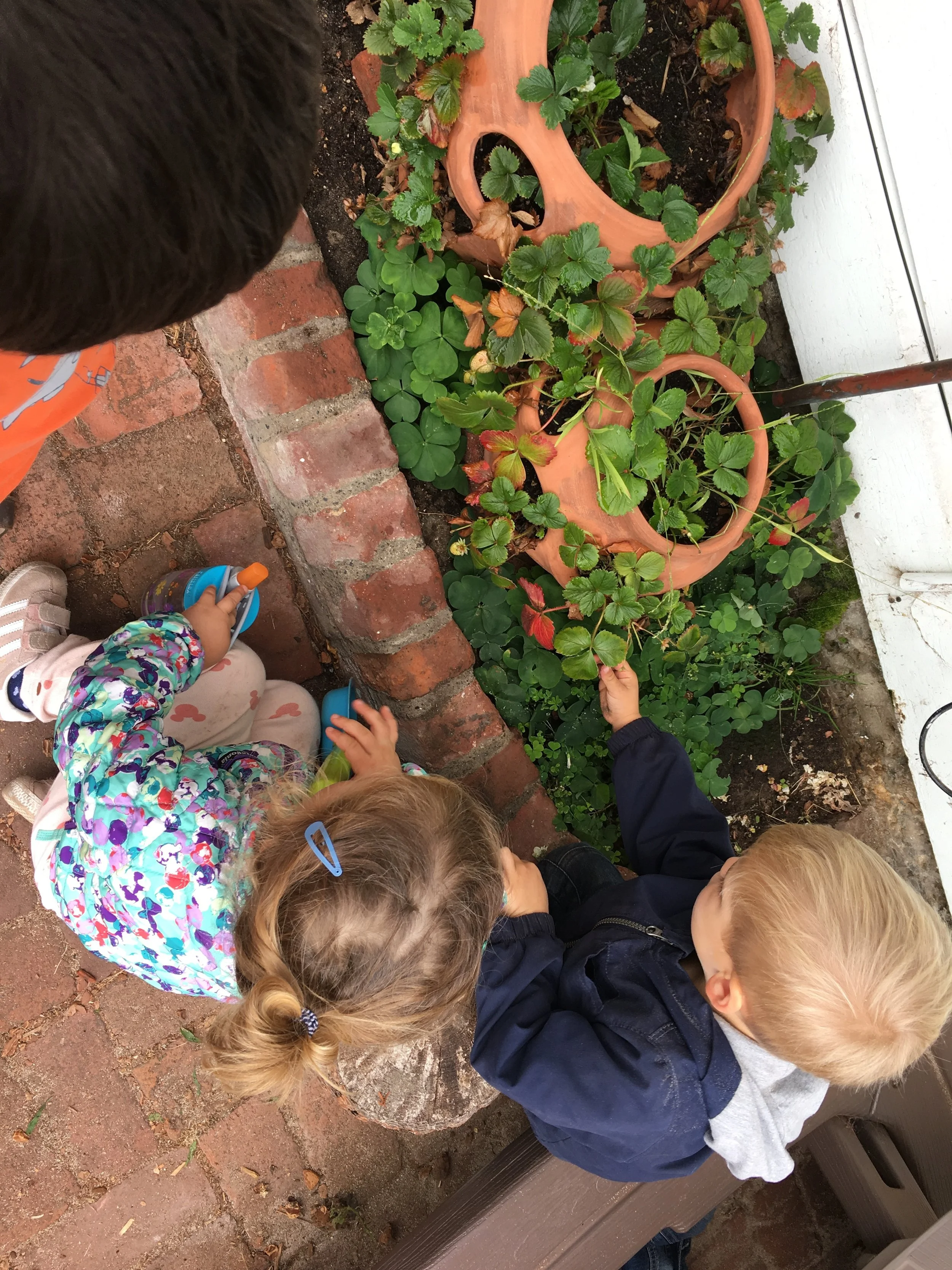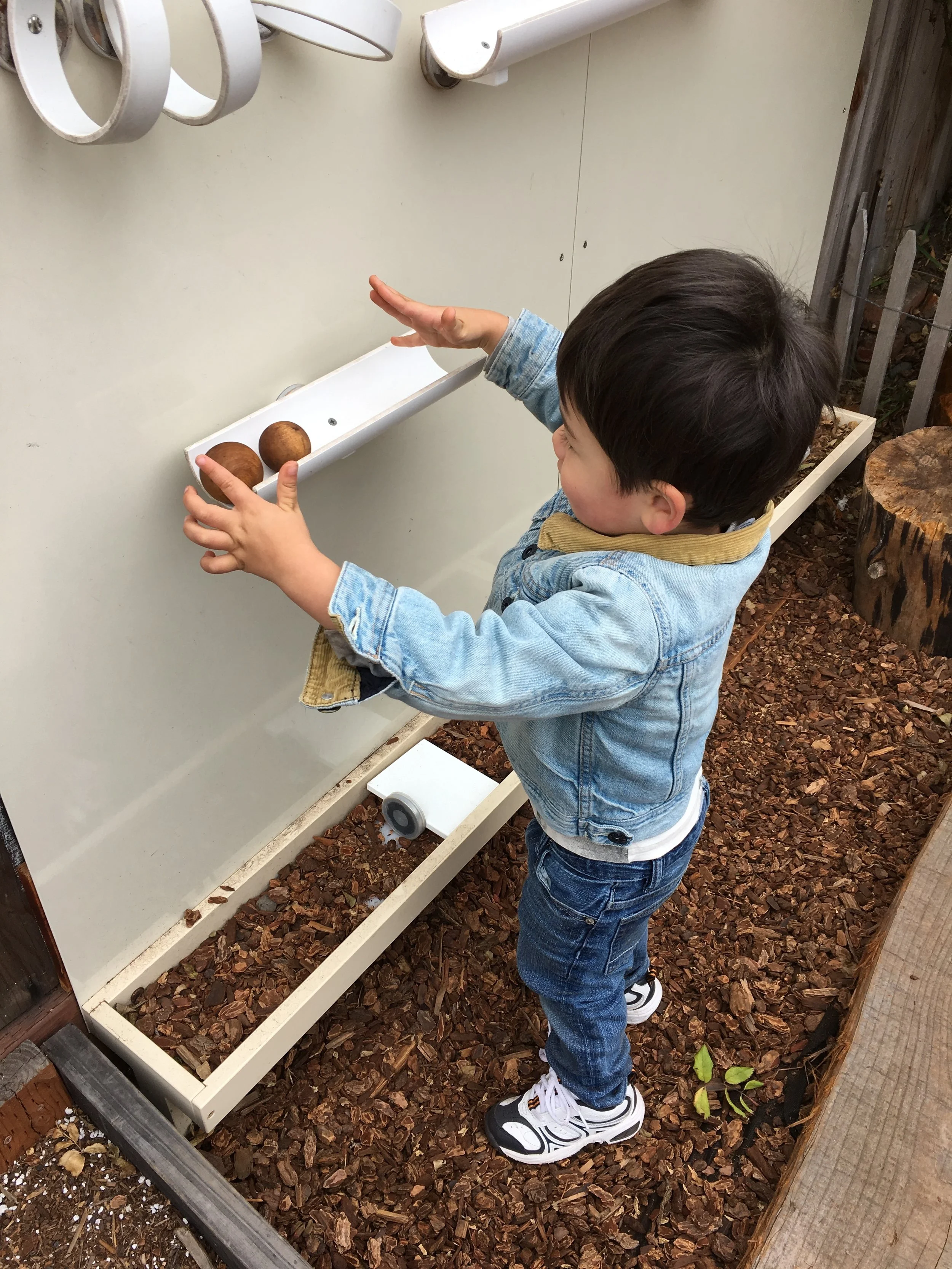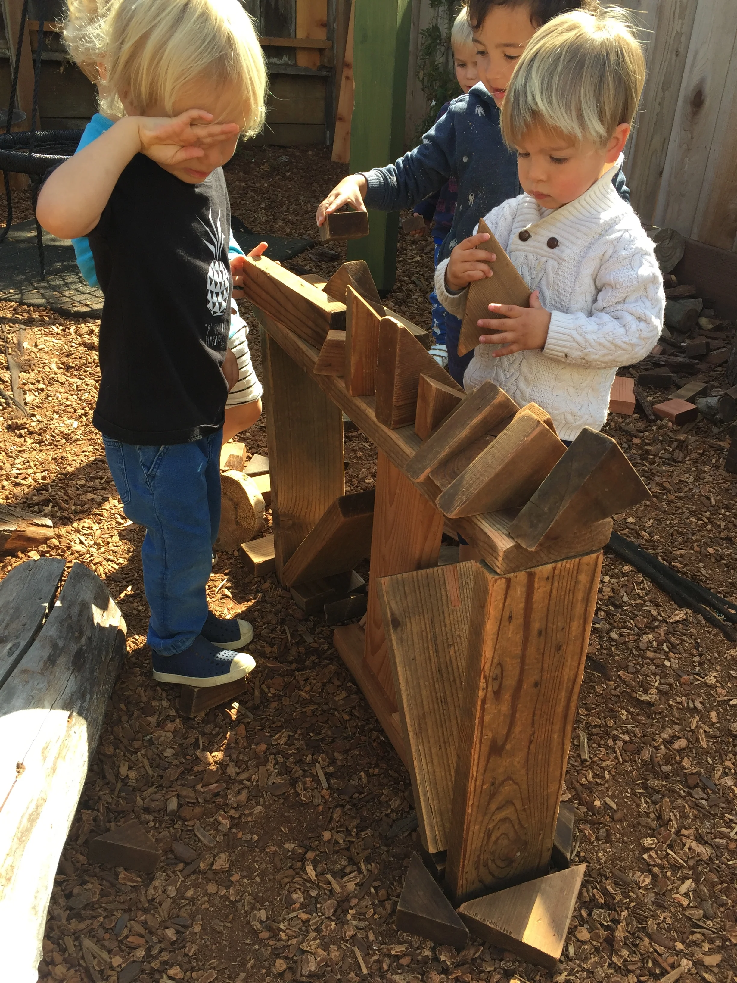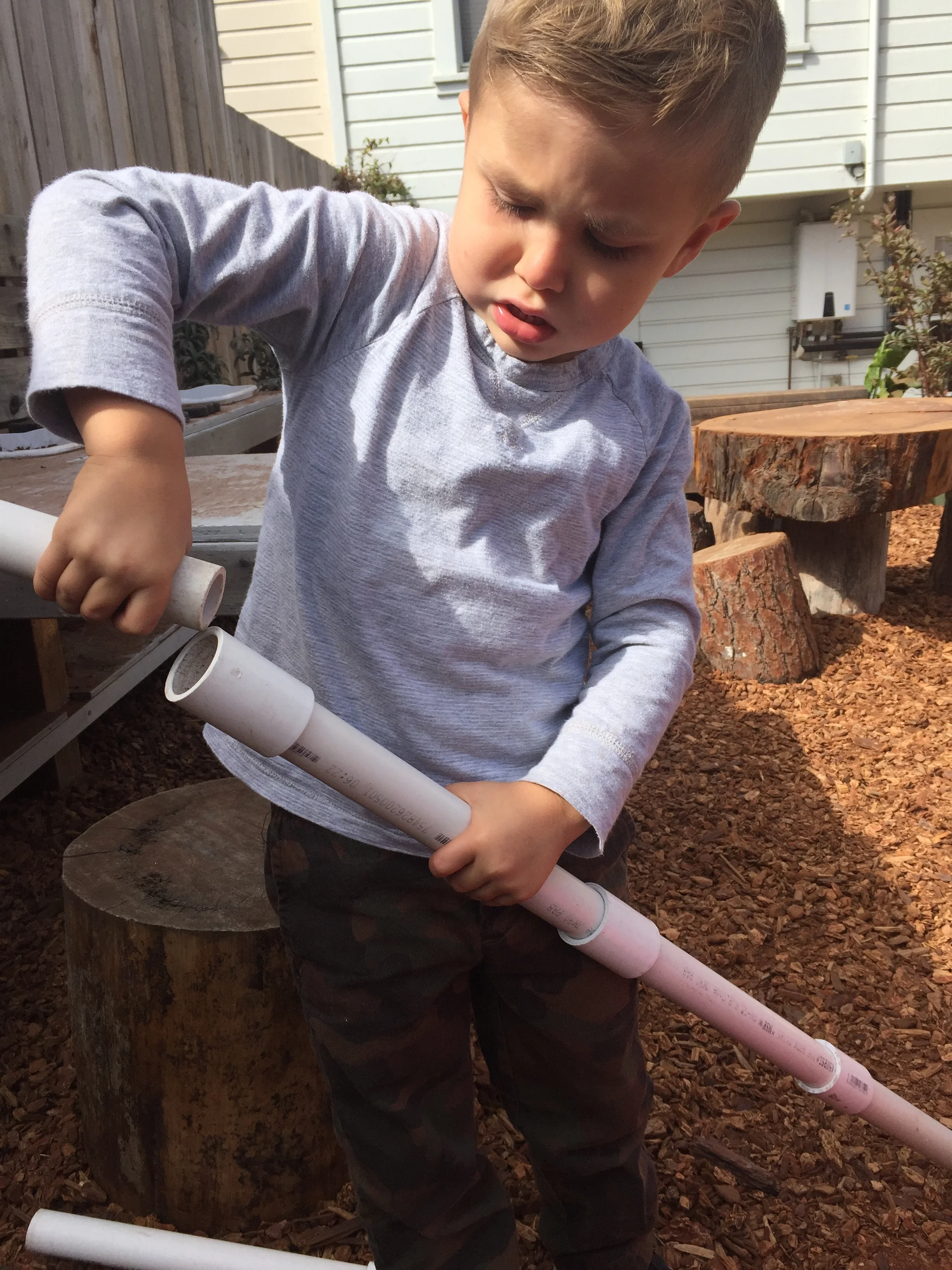 In our time outside, we have created beds using the green mats and invited our friends over for a sleepover. Sometimes, we like to pretend the mats our tortillas and we wrap our friends inside to create yummy burritos. Another huge highlight of our outdoor play is Monster Friday! We love running away from daddy monsters and playing Hide and Go Seek. Friends have turned into monsters too! We also had an adventure to the fire station, where we saw fire trucks and fire engines. We even got to see the oxygen tanks and masks that firefighters use, as well as other equipment like saws. Our trip to the fire station has inspired a lot of our play. We like to connect the pipes together to pretend they are hoses as we spray away anything and everything that catches on fire and build a fire station using the blocks.