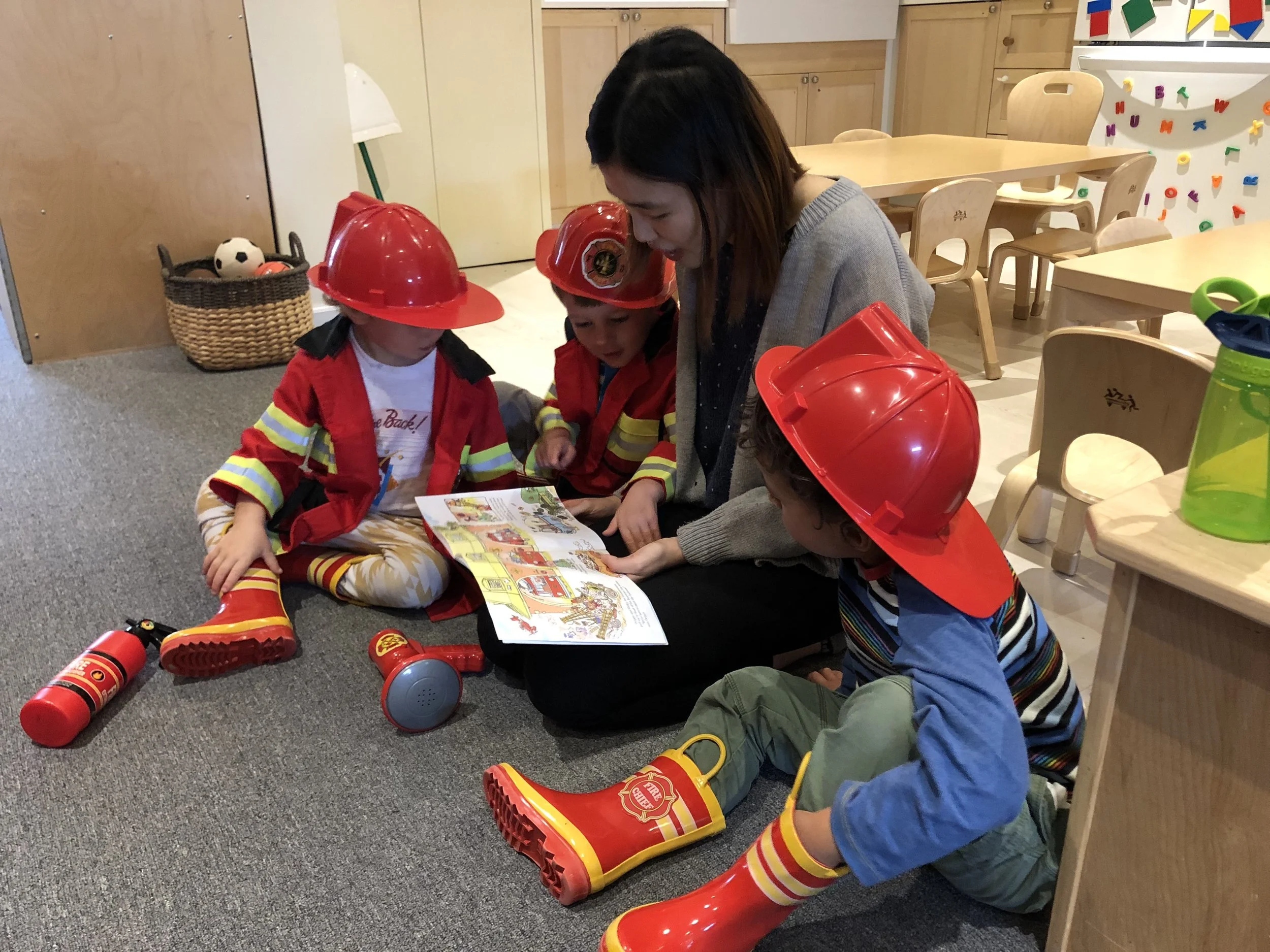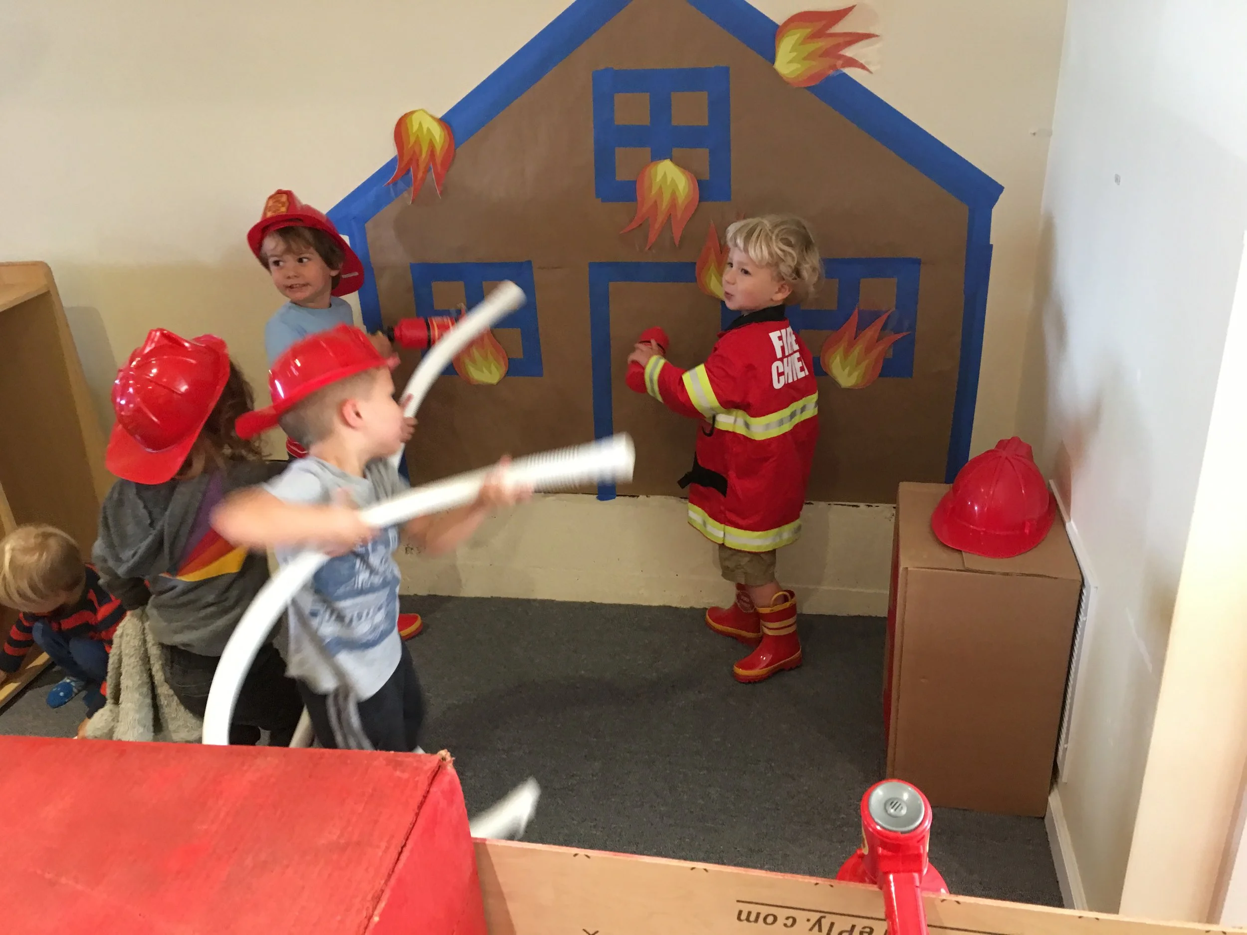 Wee-ooo! Wee-oo! In the past few weeks, our grocery store has transformed into a busy fire station! We firefighters have been working hard as a team to put out any fires or emergencies that occur. For each mission, we make sure we wear our fire-proof jackets and boots and bring our hoses and megaphones. So far, we have received calls to save houses, pizza parlors, schools that catch on fire as well as animals that cannot get down from high places. We have been successful each time!