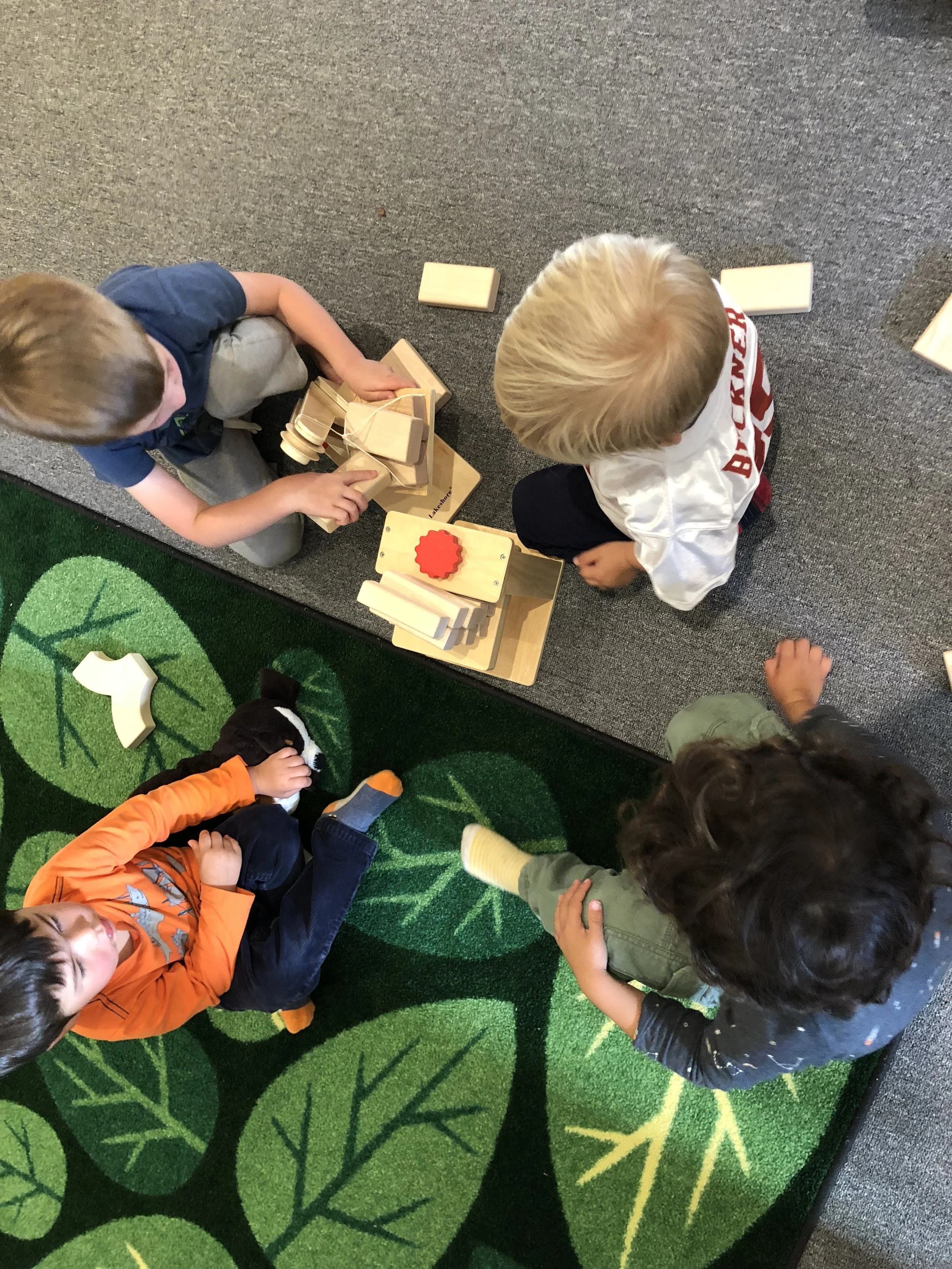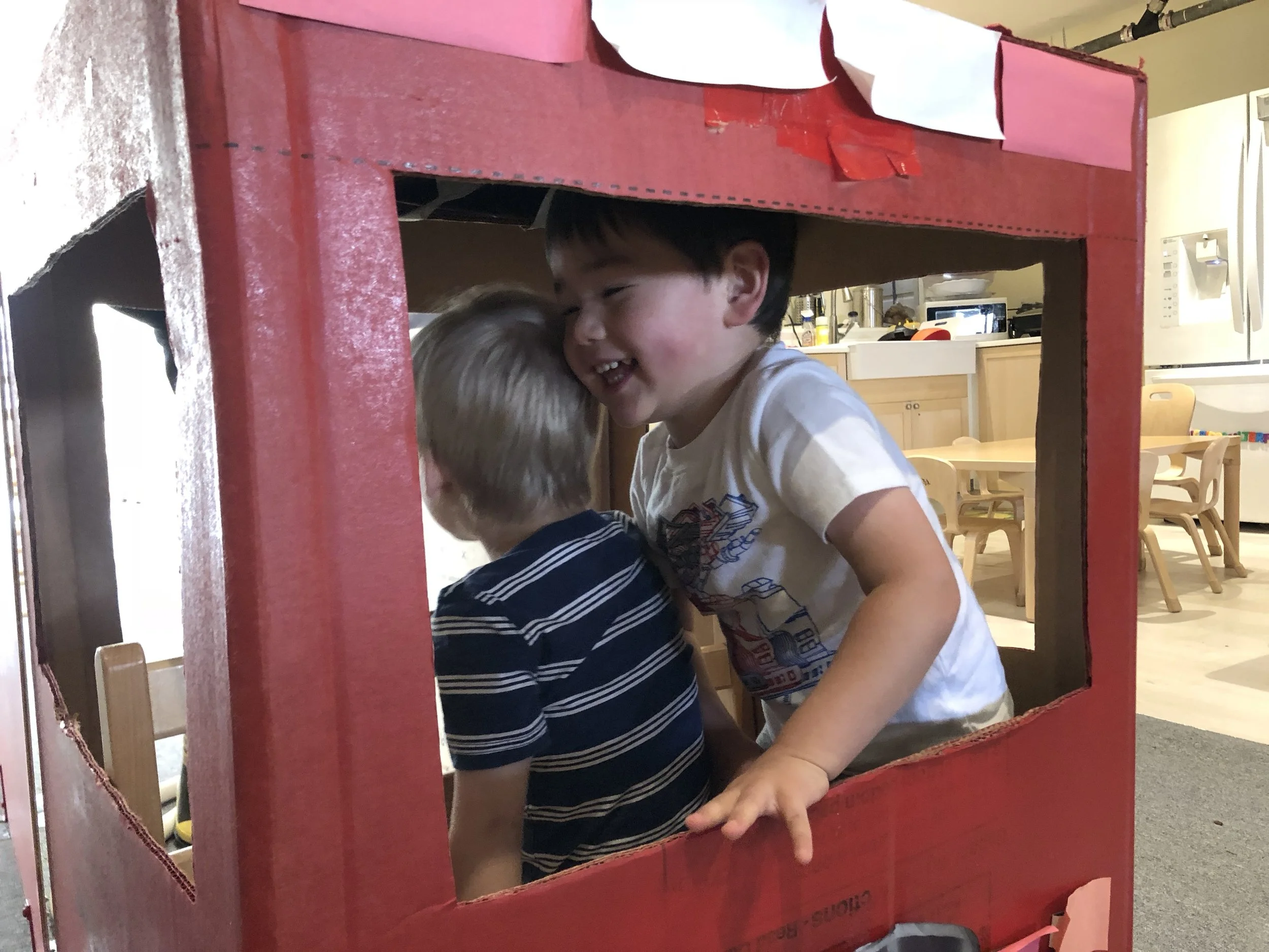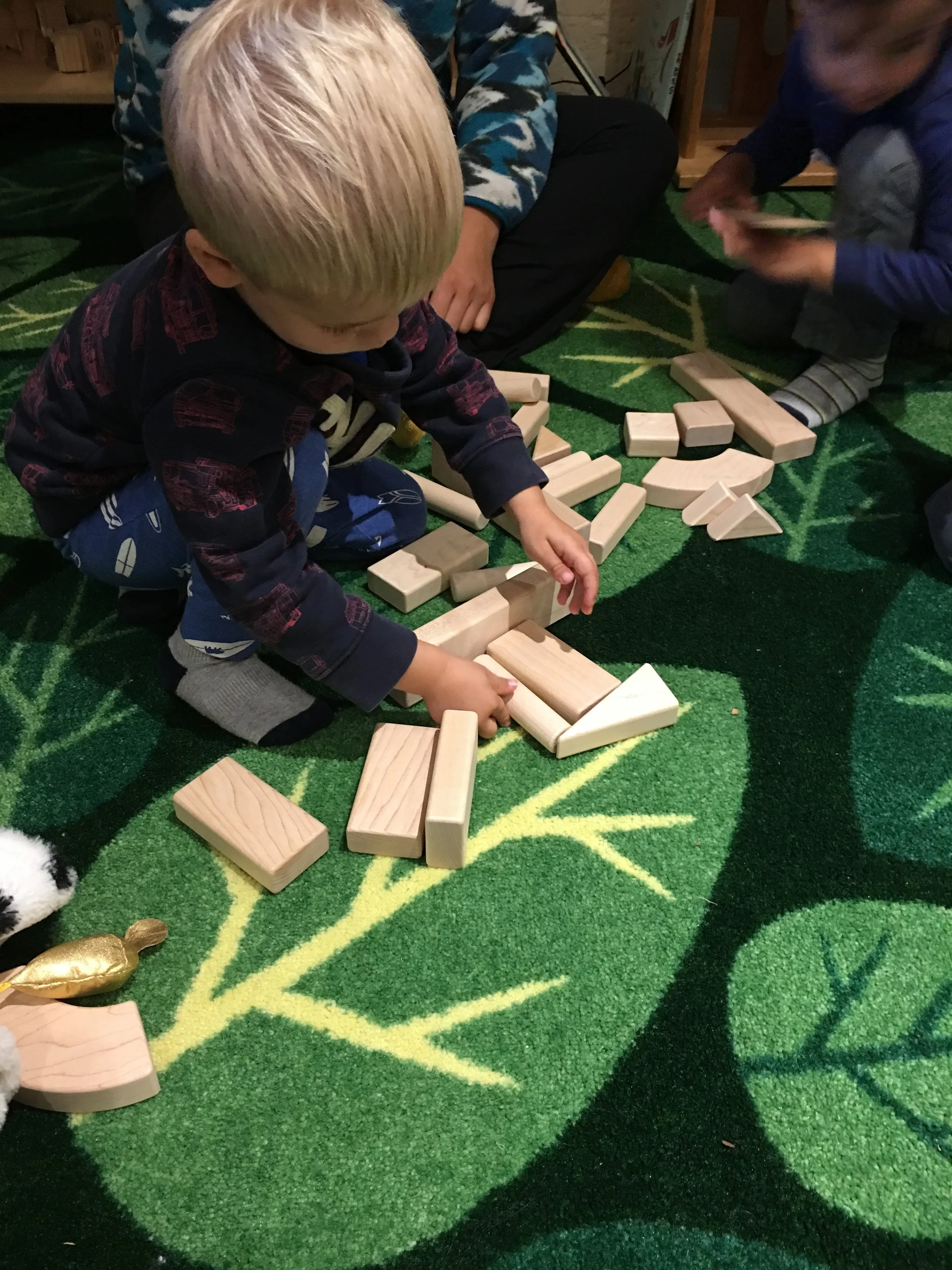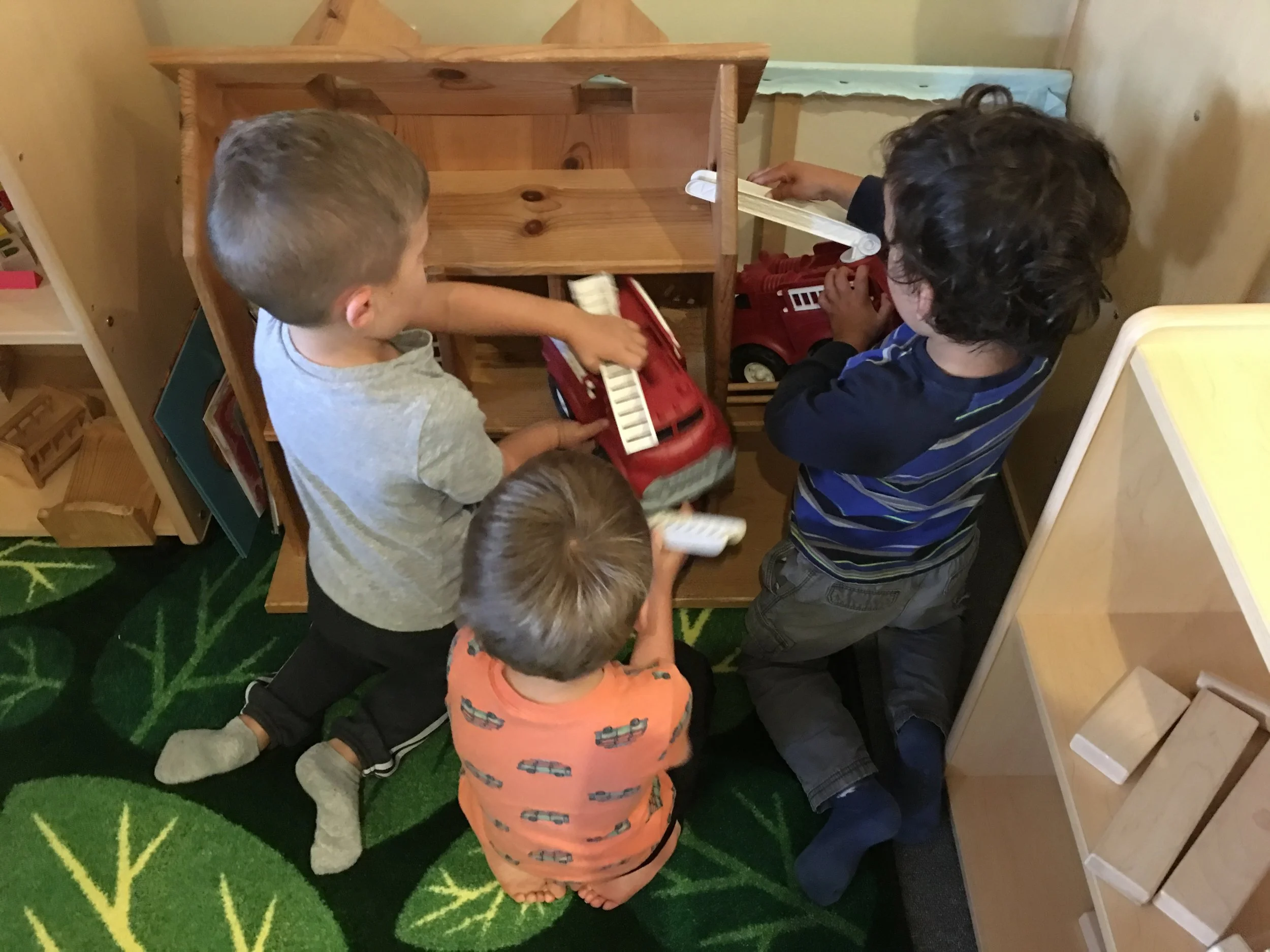 We love placing blocks on our freight loaders and wheeling them up, being careful so as not to drop them! We also enjoy arranging the blocks next to each other to create roads that our toy cars can travel on, as well as using the blocks to create towers as tall as we can without them collapsing. When we’re not in the fire truck housed in the dramatic play area, we like driving the smaller fire trucks around and working together to save the dollhouse whenever it catches on fire. We are always sure to sound, “Wee-ooo, Wee-ooo, Wee-o,” when we’re on the way and we always make sure to stretch out the ladders on our trucks so that we can reach up high.