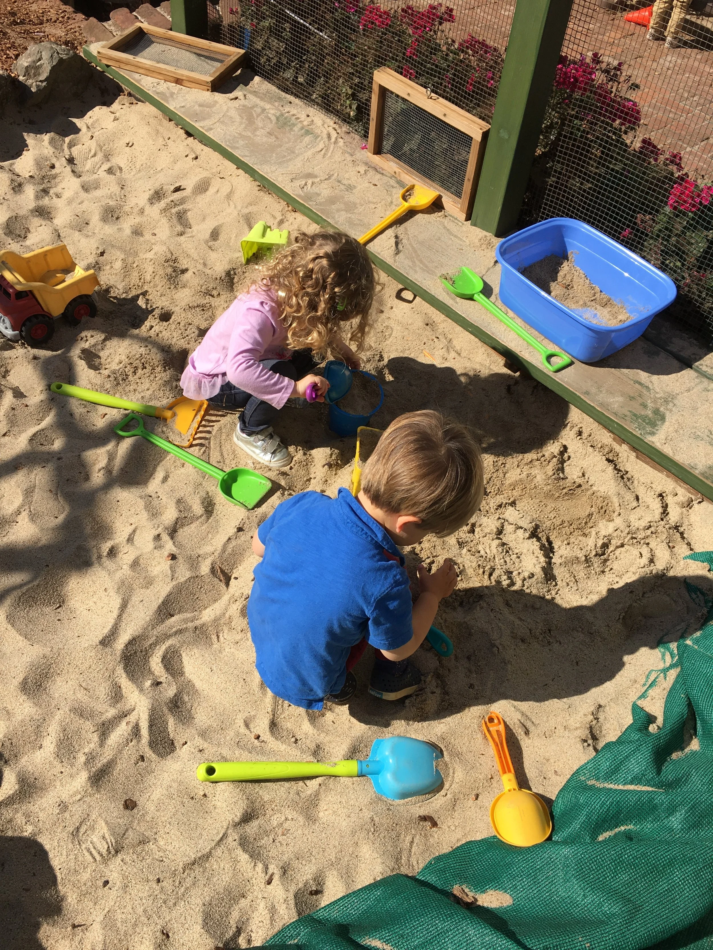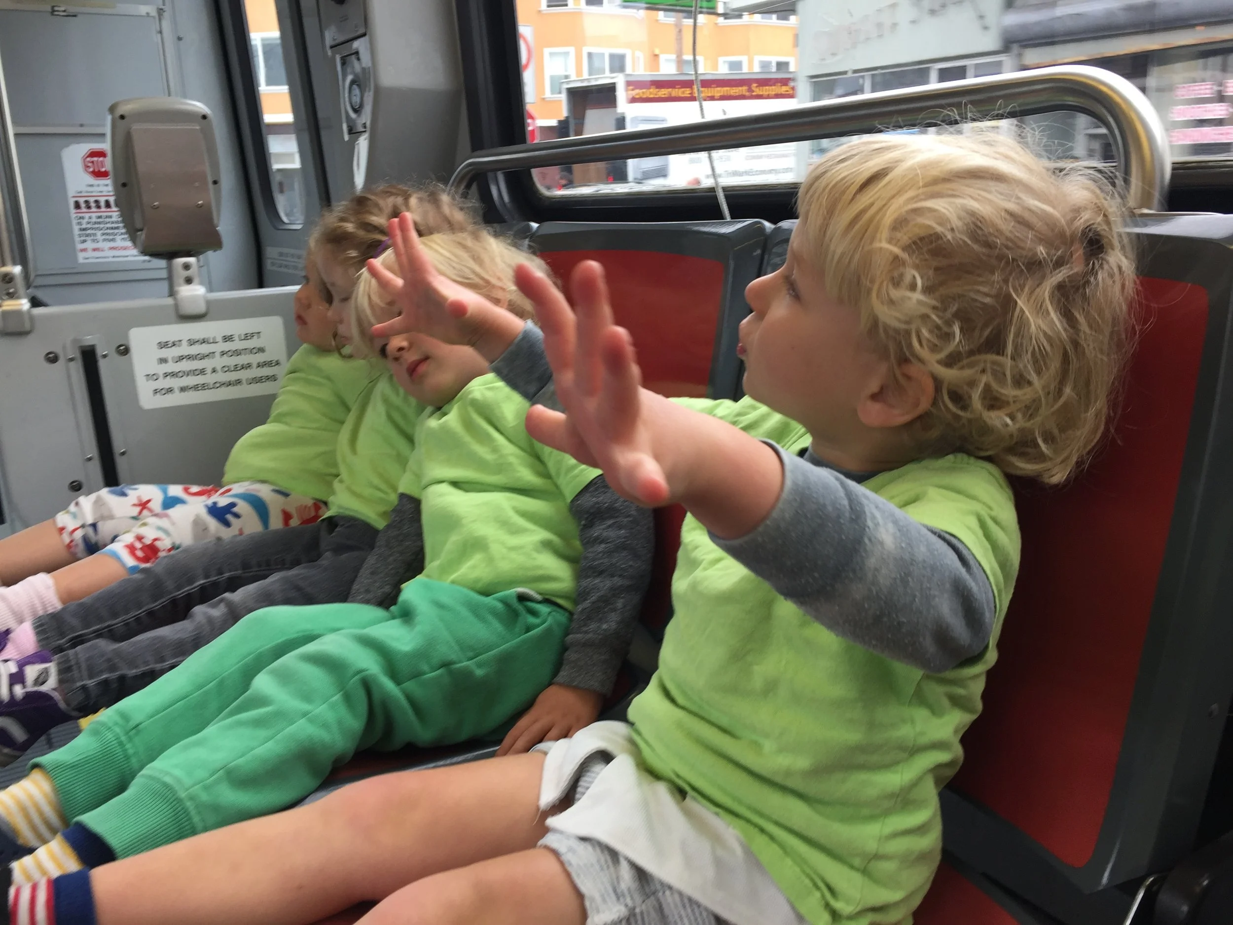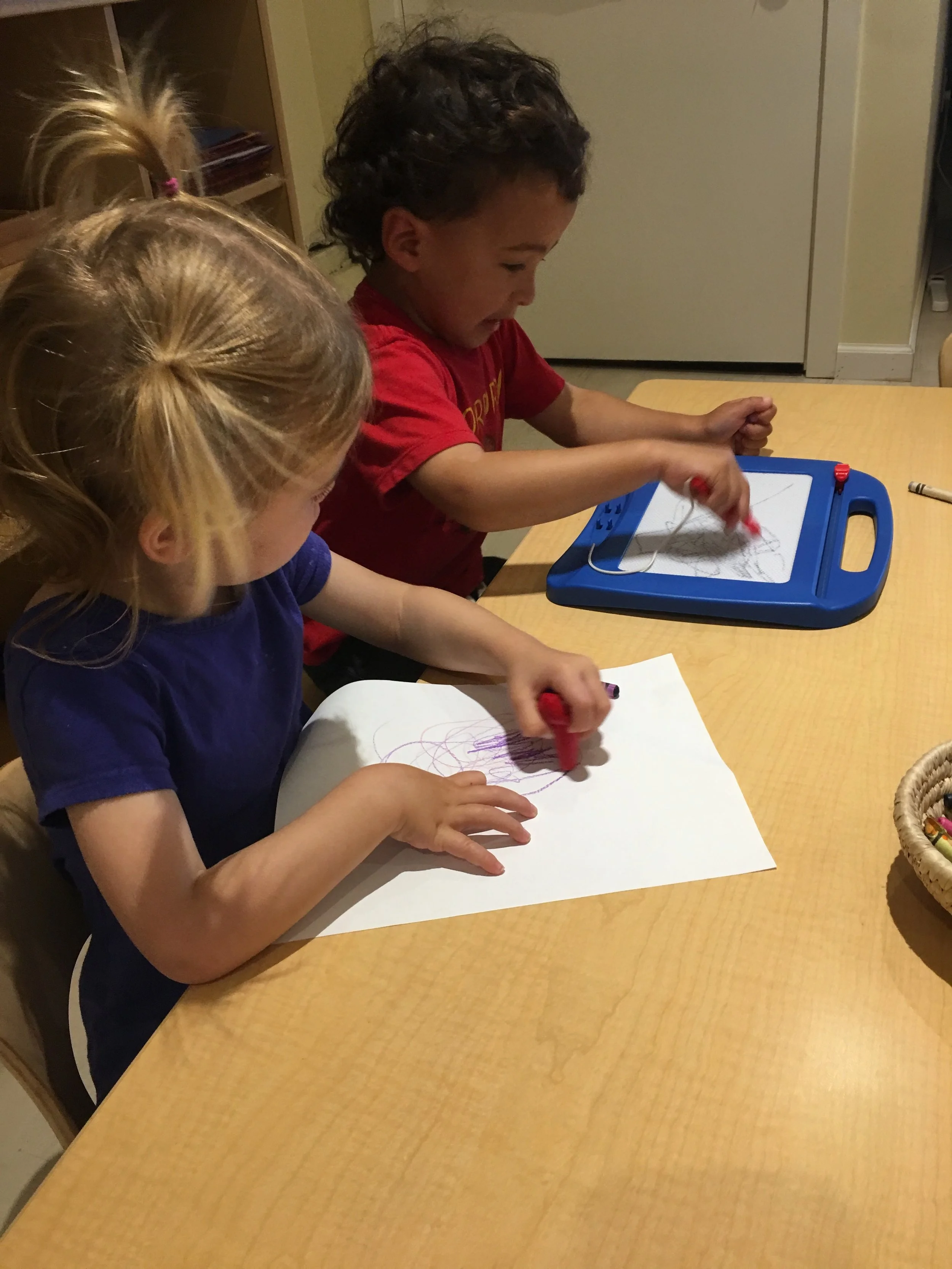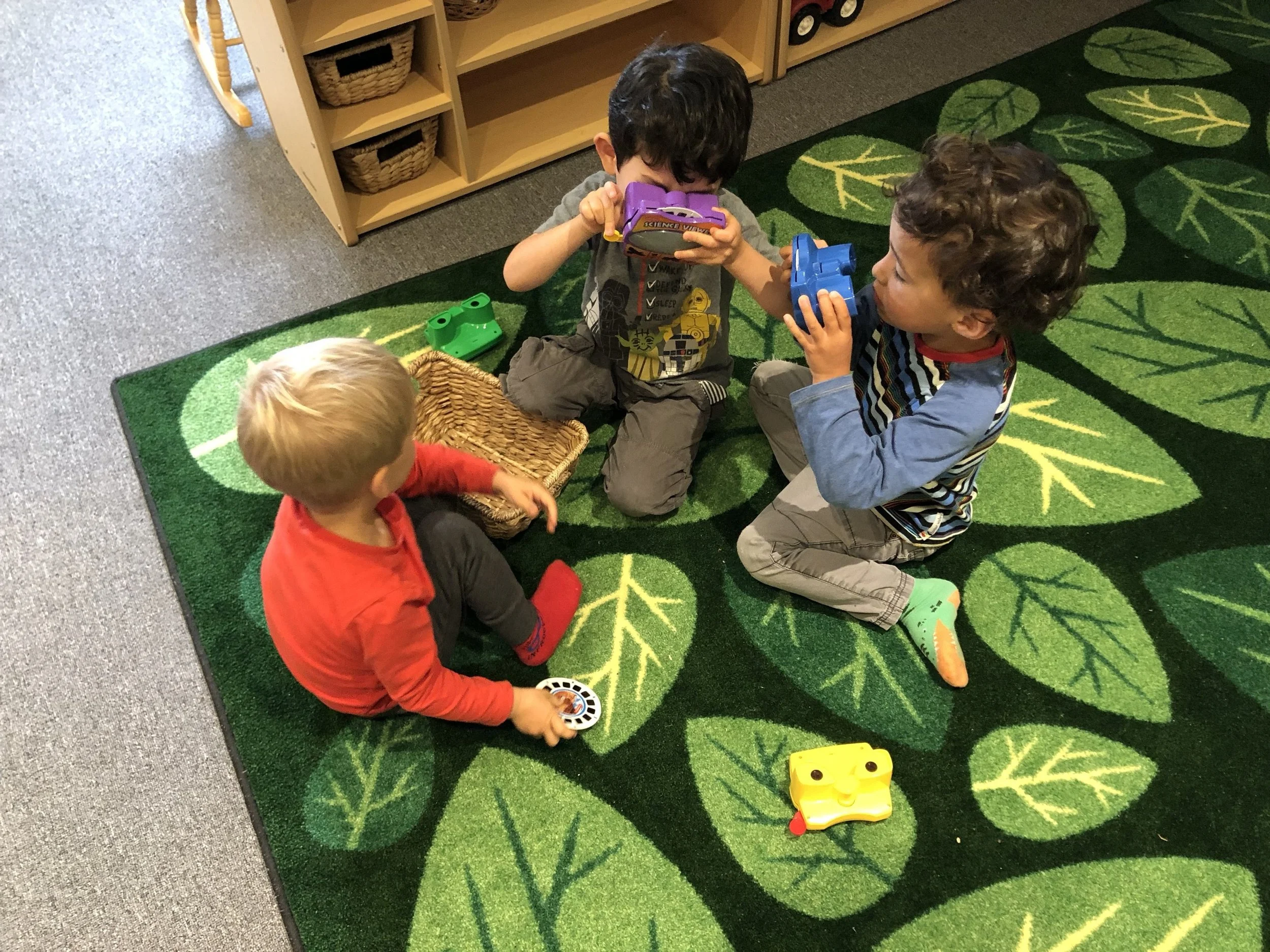 We love placing blocks on our freight loaders and wheeling them up, being careful so as not to drop them! We also enjoy arranging the blocks next to each other to create roads that our toy cars can travel on, as well as using the blocks to create towers as tall as we can without them collapsing. When we’re not in the fire truck housed in the dramatic play area, we like driving the smaller fire trucks around and working together to save the dollhouse whenever it catches on fire. We are always sure to sound, “Wee-ooo, Wee-ooo, Wee-o,” when we’re on the way and we always make sure to stretch out the ladders on our trucks so that we can reach up high.