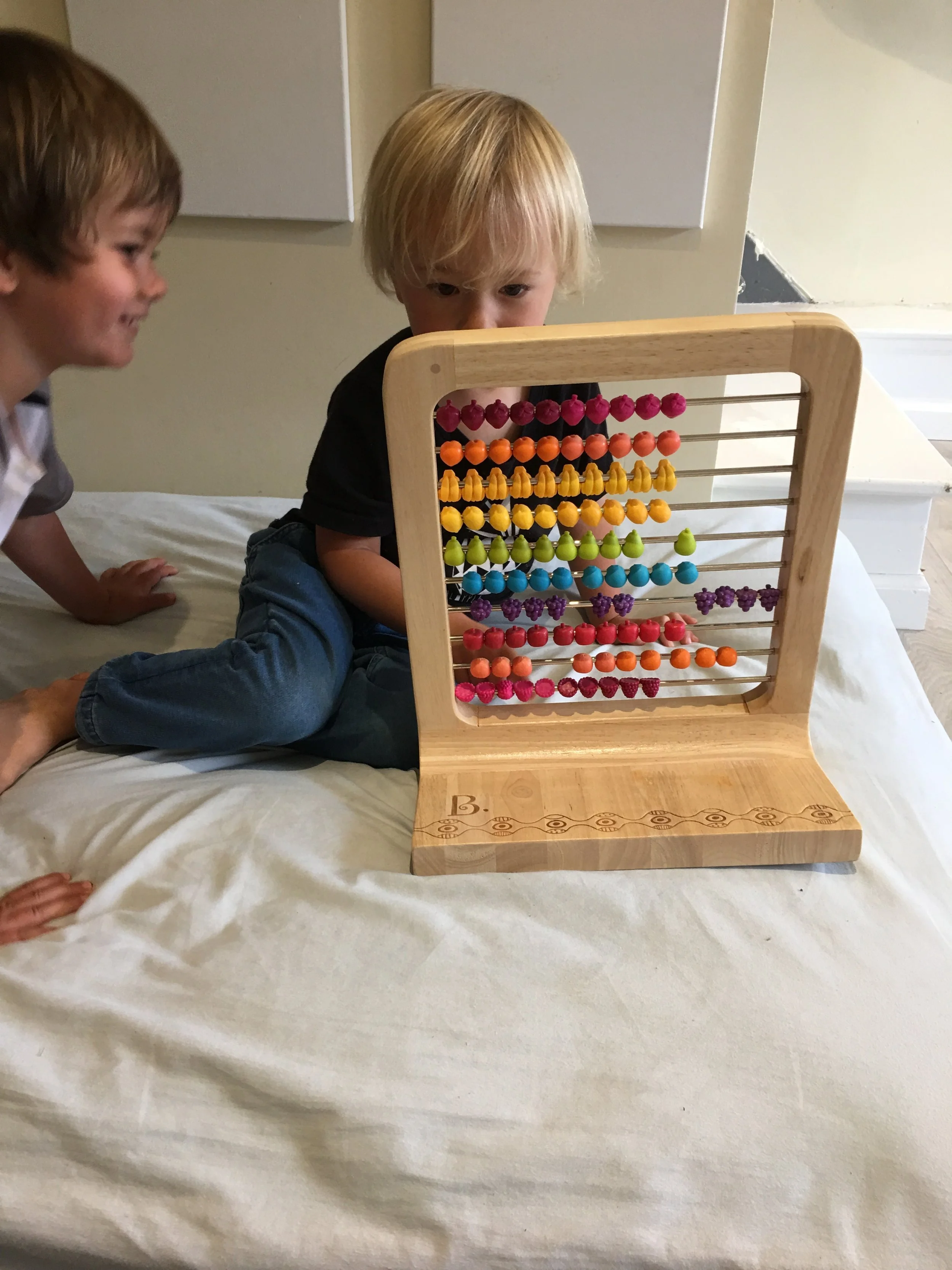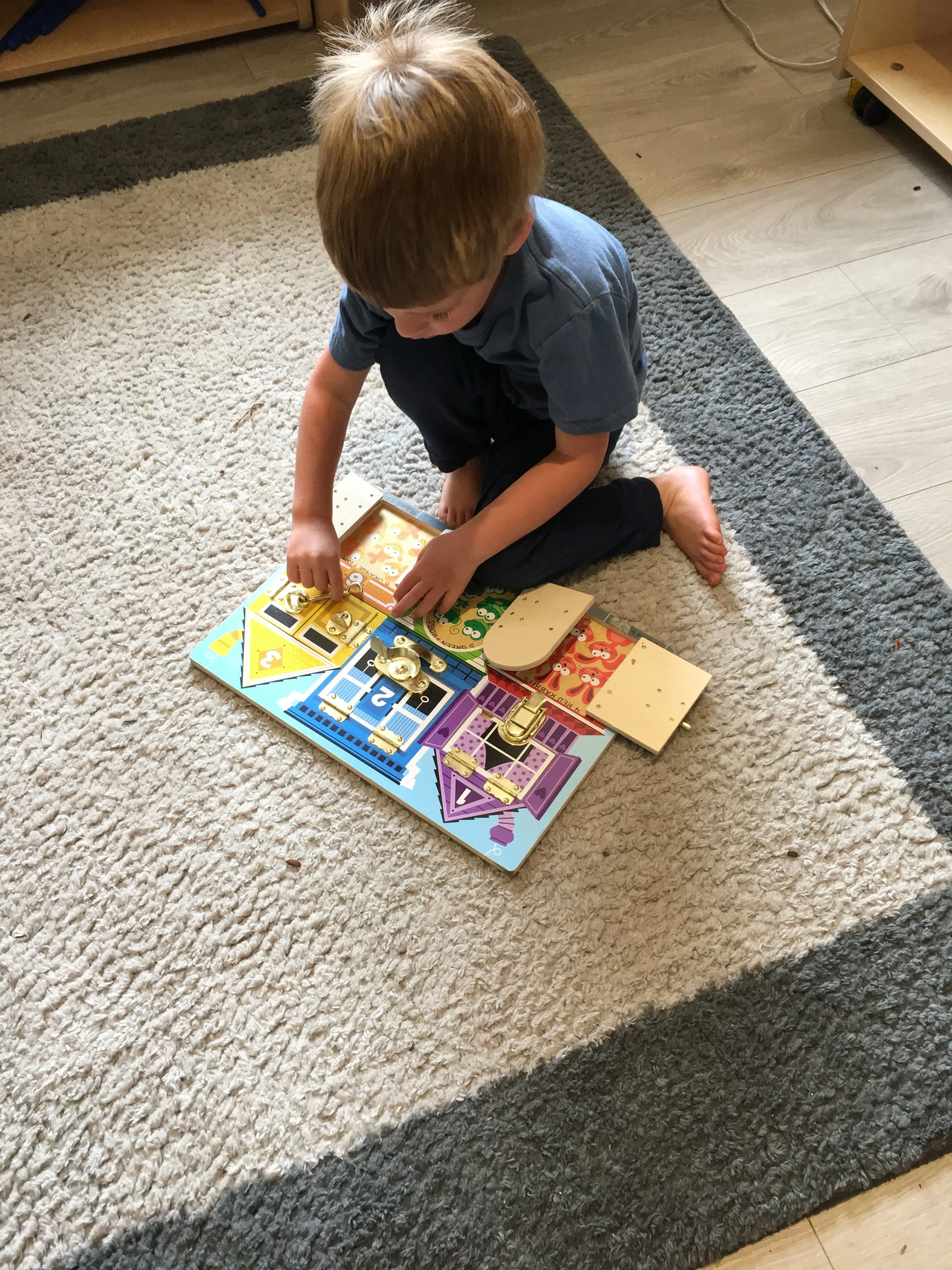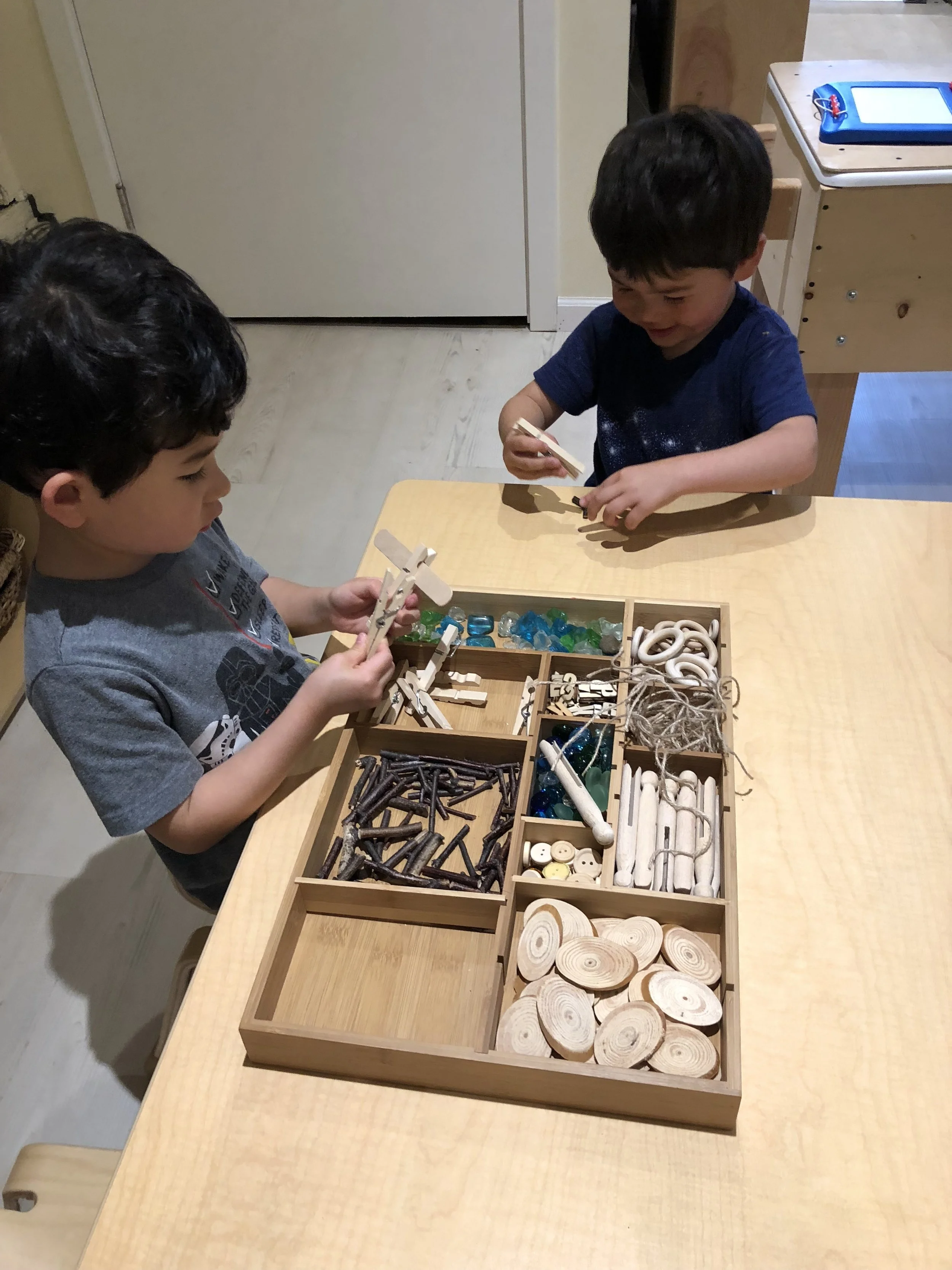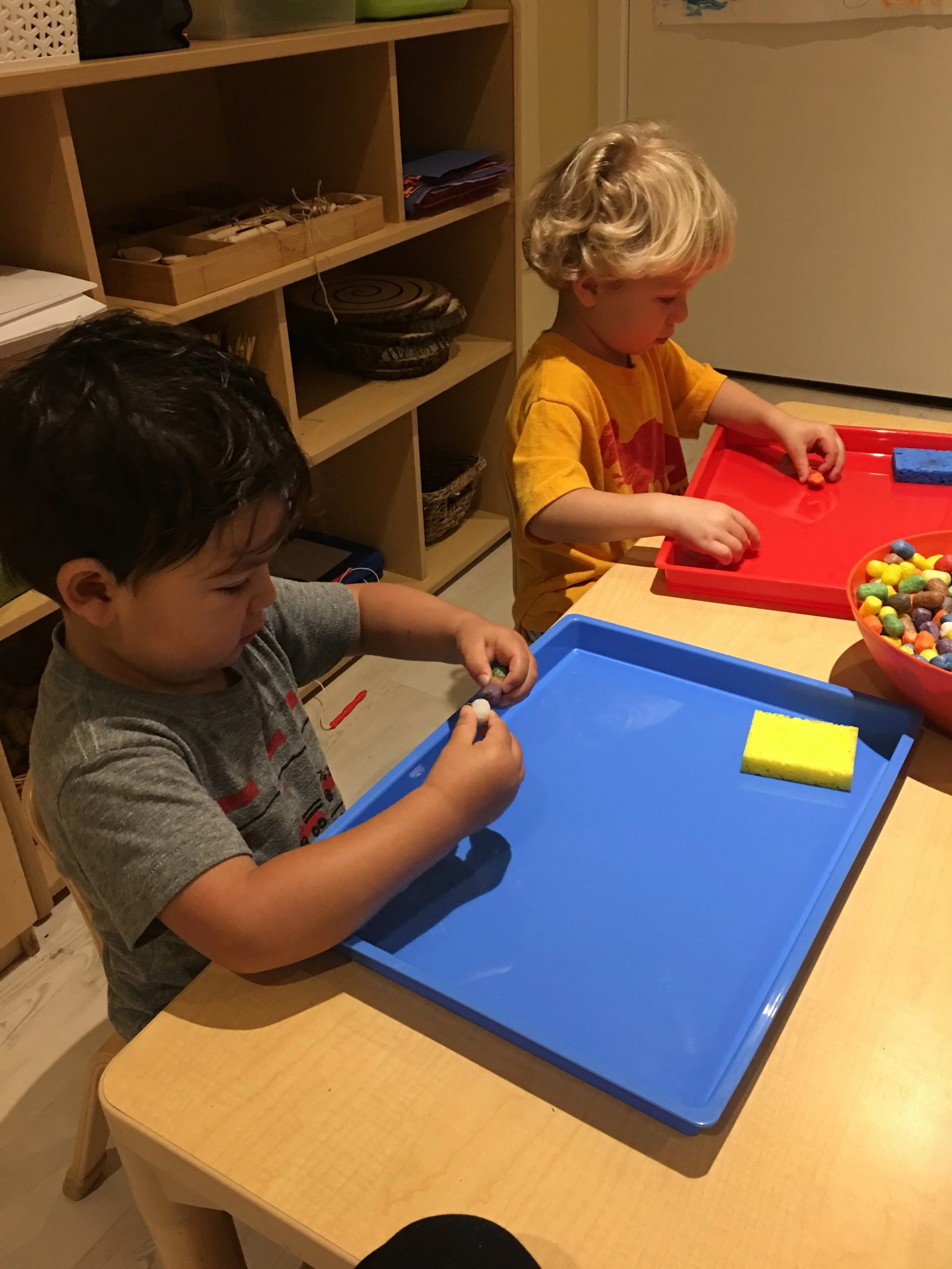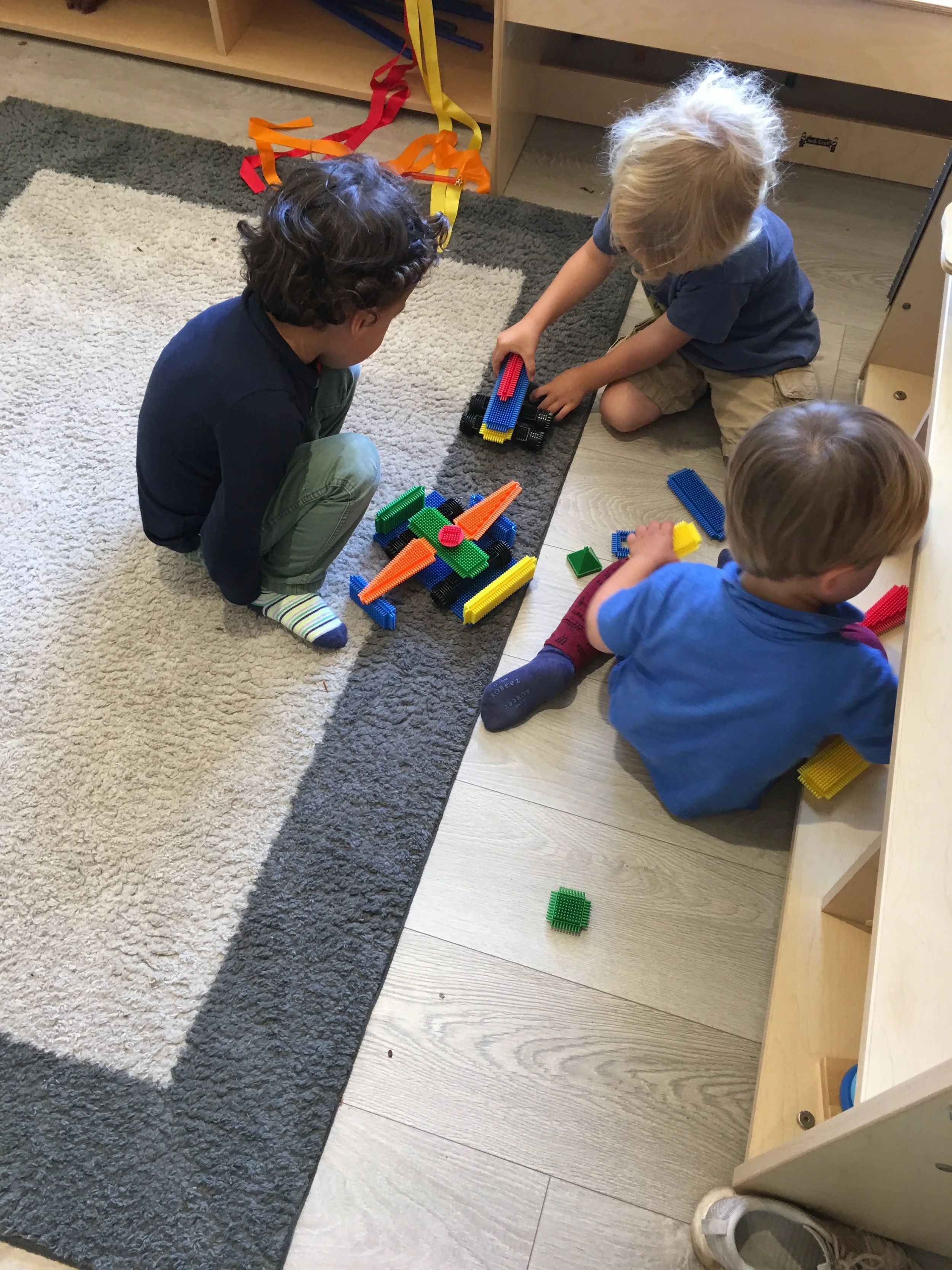 We have been having lots of fun building airplanes, rockets, and cars with the bristle blocks. We like to take our creations with us around the classroom to show our peers. We also really like counting the fruit and opening the doors on the board to see what animal is hiding behind it and how many of them there are.