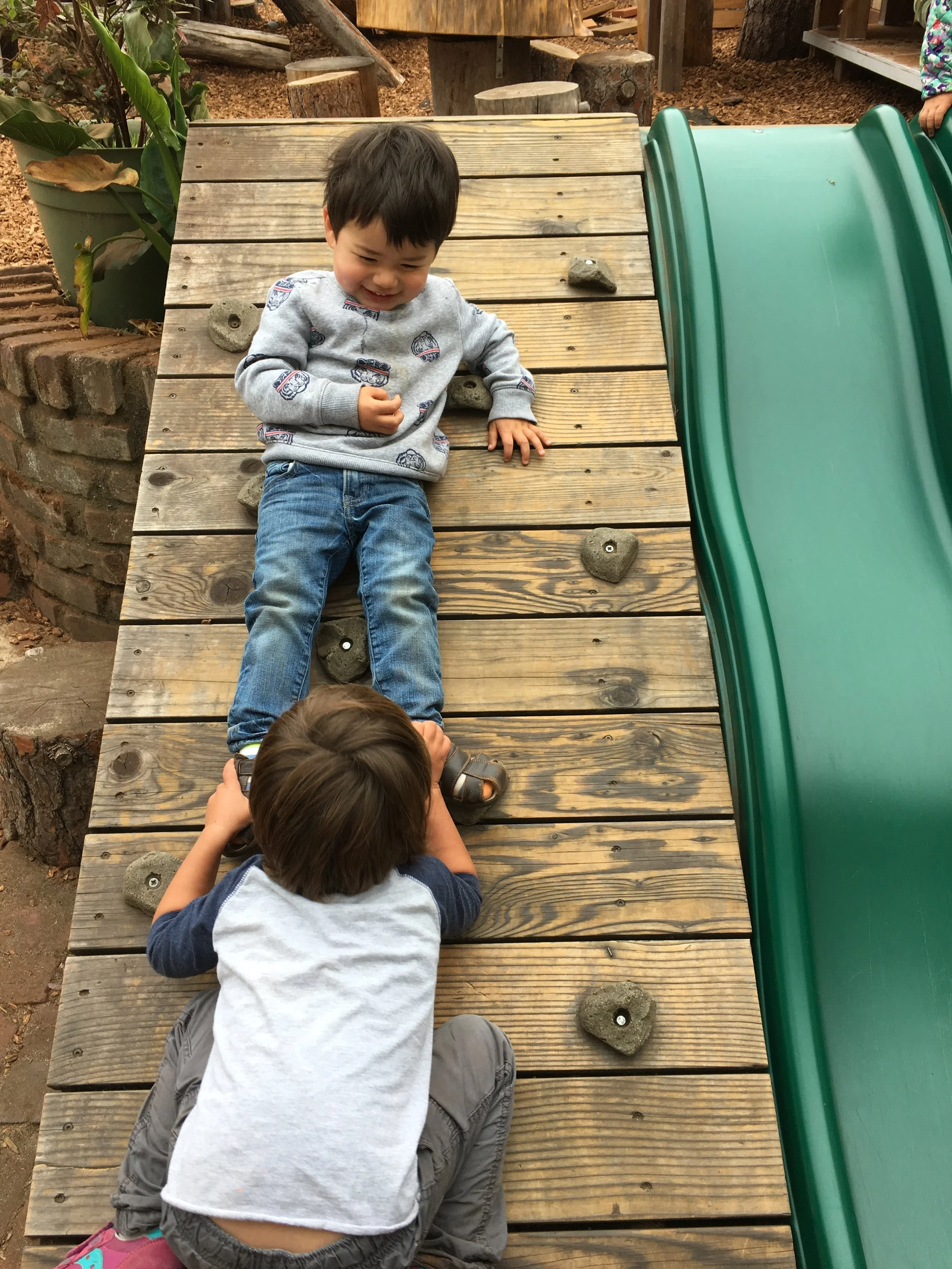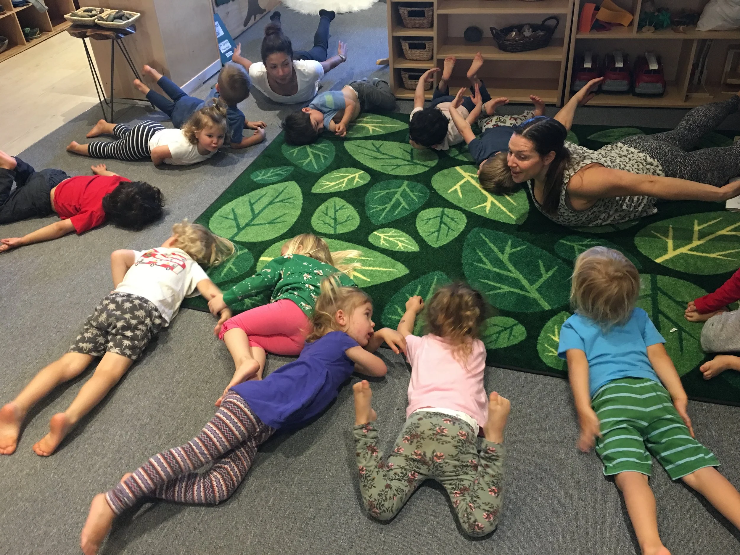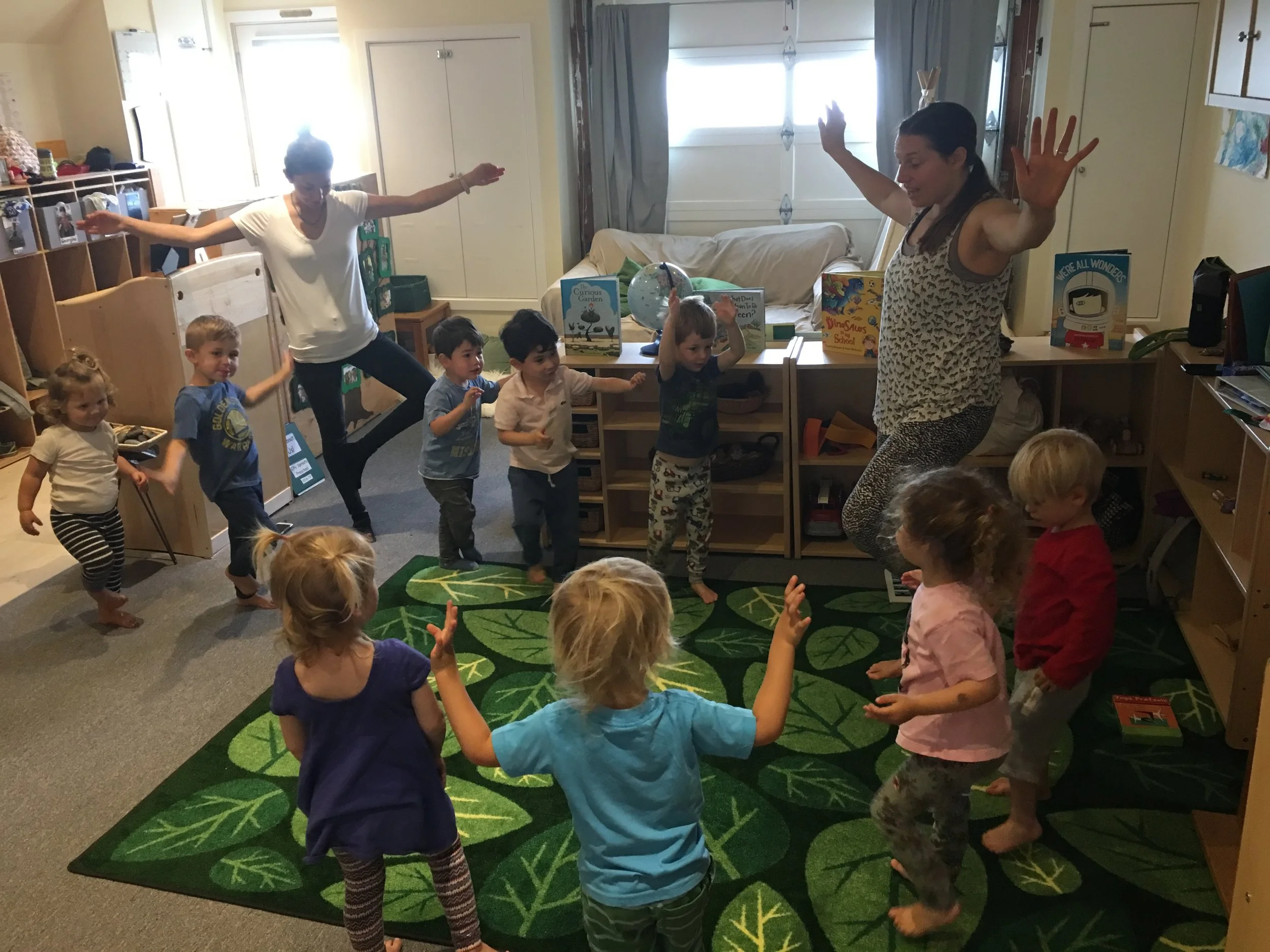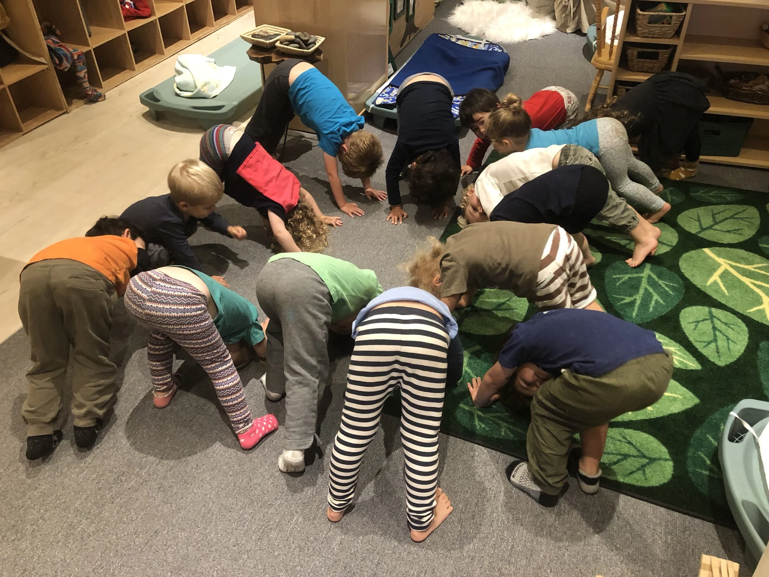With our energetic bodies, we love climbing up and down the ladder and sliding down to the mattress, where we jump up and down and pretend to be monkeys. We also love rolling around with our friends on the mattress too! Every Friday, we have been practicing different yoga poses, including frog pose, spider pose, airplane pose, tree pose, and boat pose. One of our favorite poses is the down-dog pose!