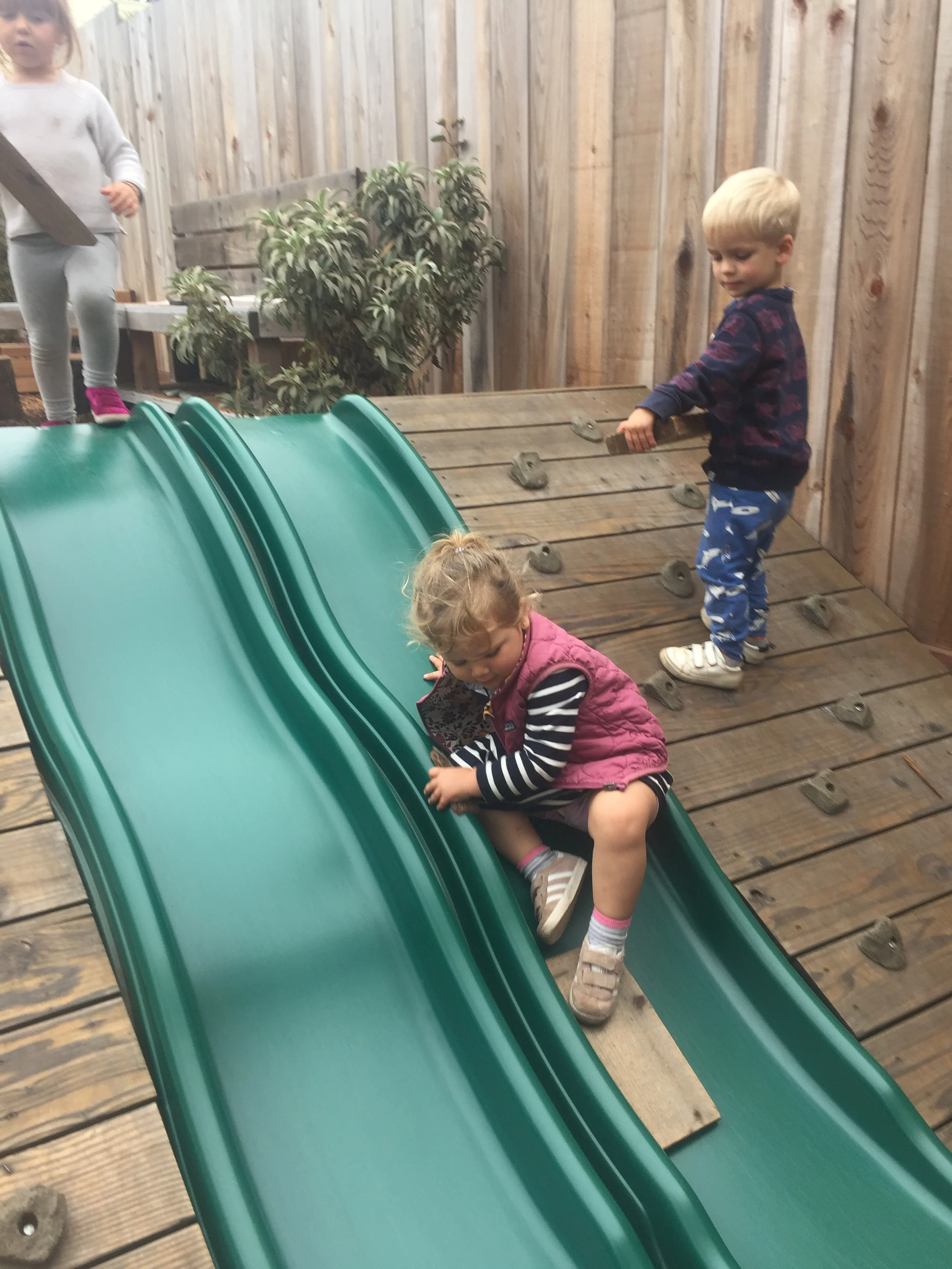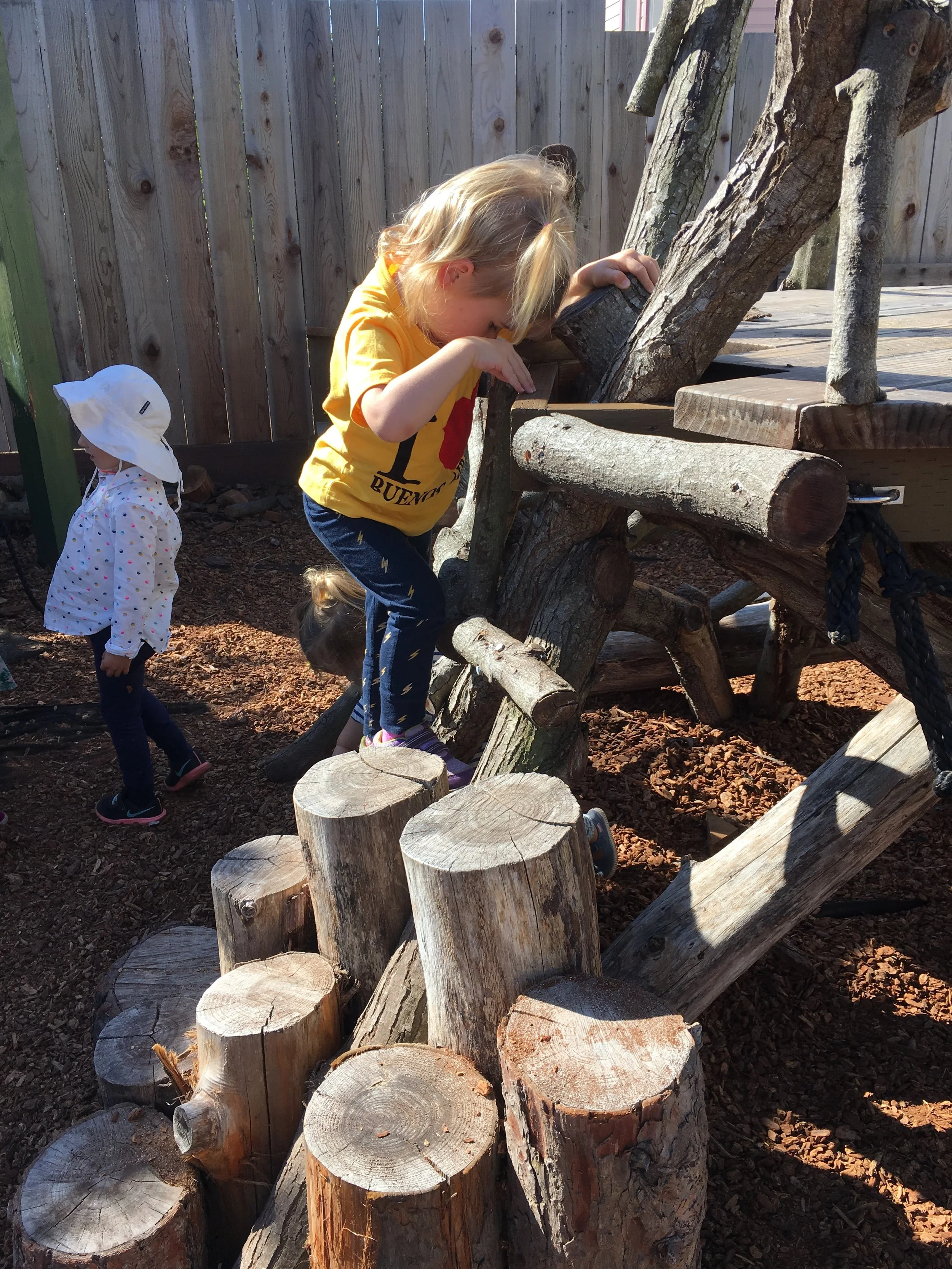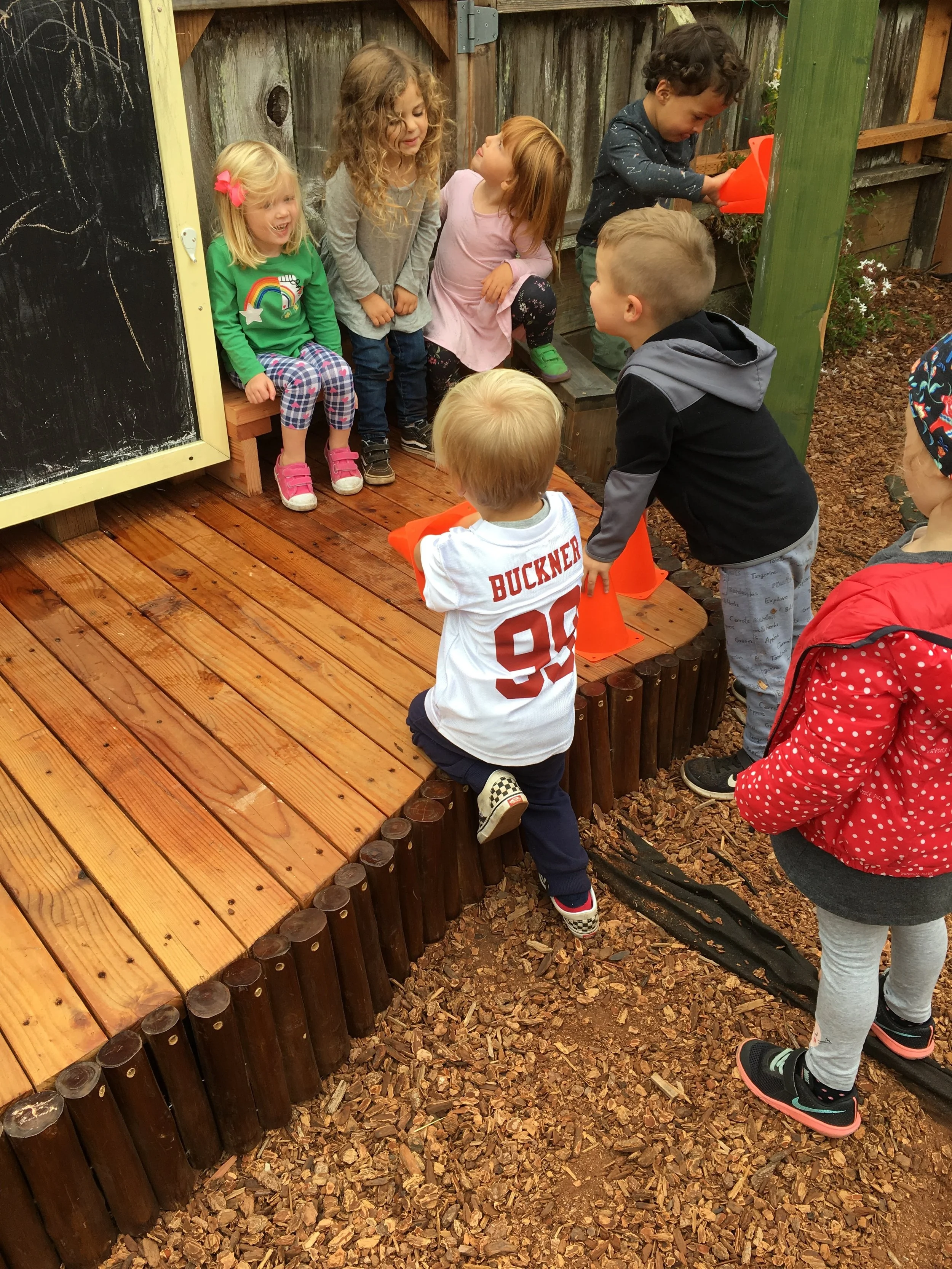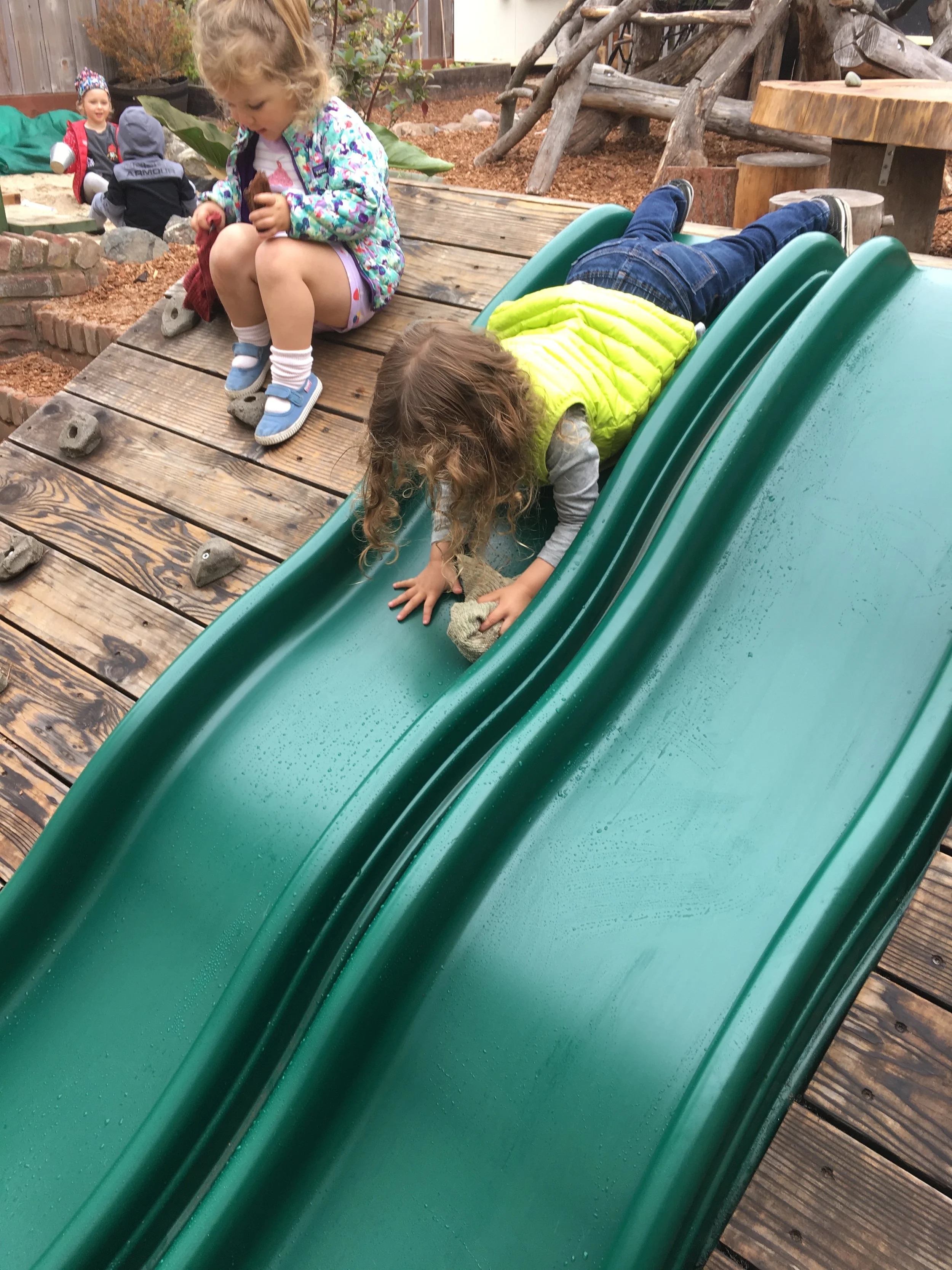 With our energetic bodies, we love climbing up and down the ladder and sliding down to the mattress, where we jump up and down and pretend to be monkeys. We also love rolling around with our friends on the mattress too! Every Friday, we have been practicing different yoga poses, including frog pose, spider pose, airplane pose, tree pose, and boat pose. One of our favorite poses is the down-dog pose!