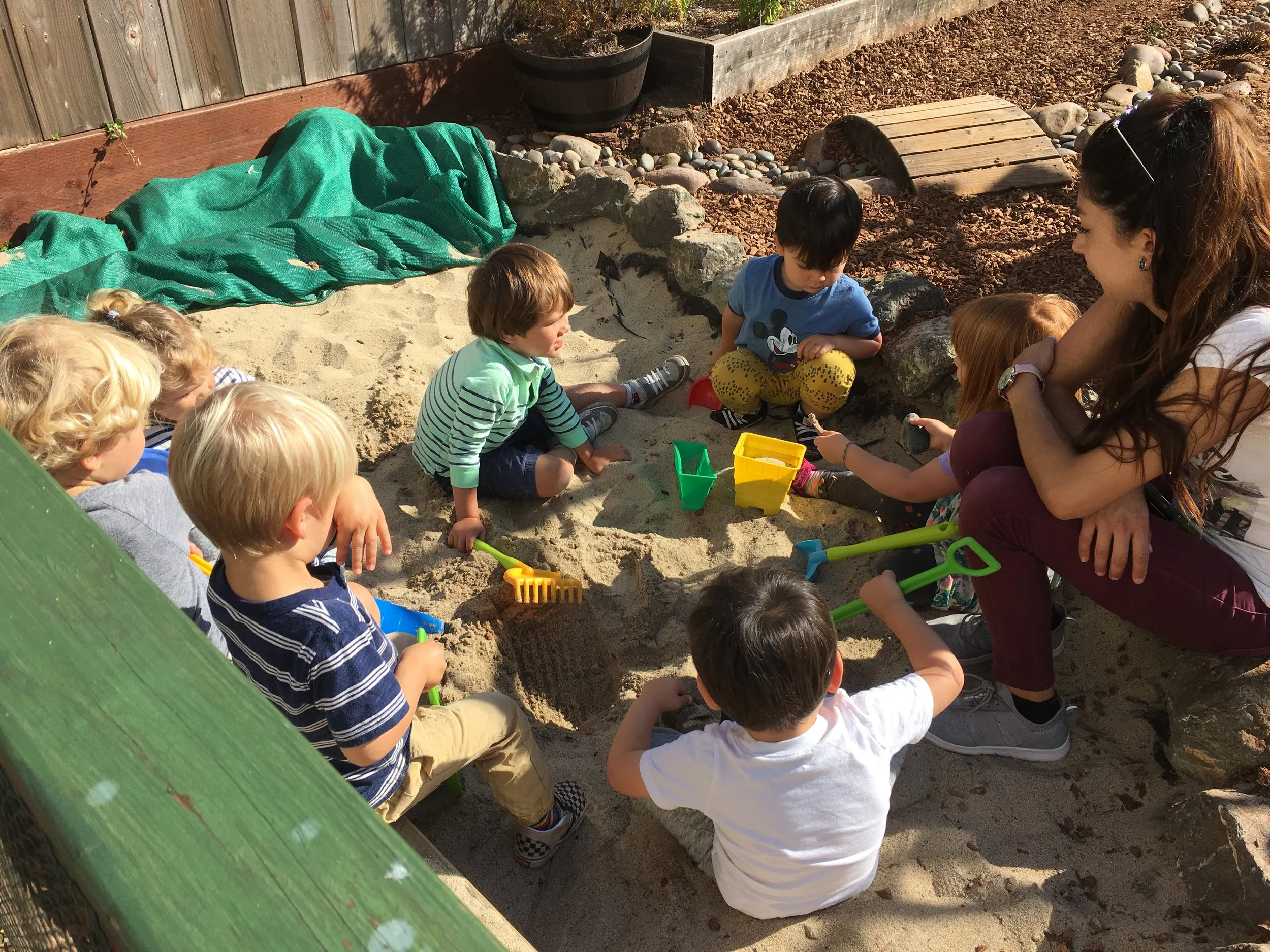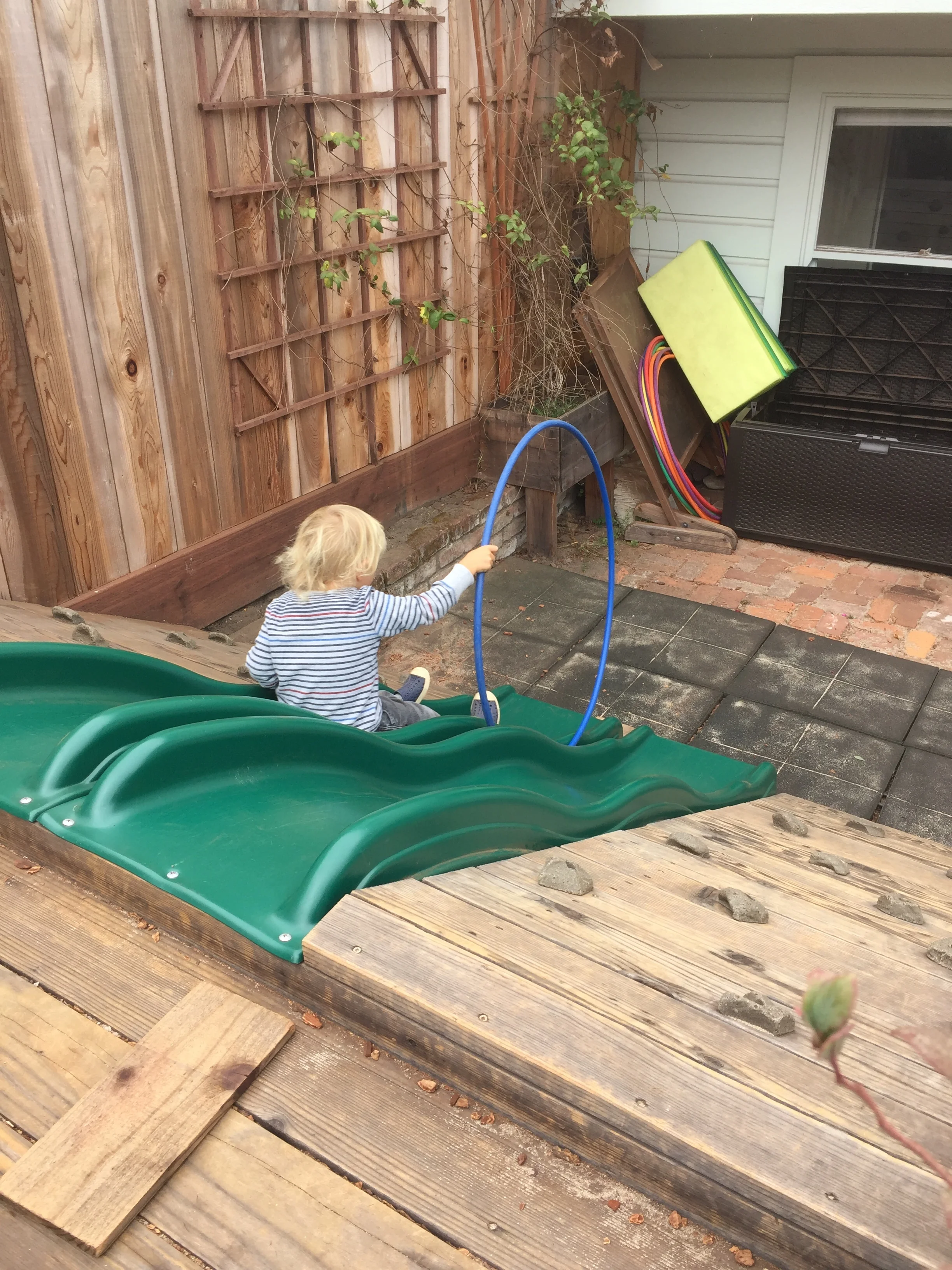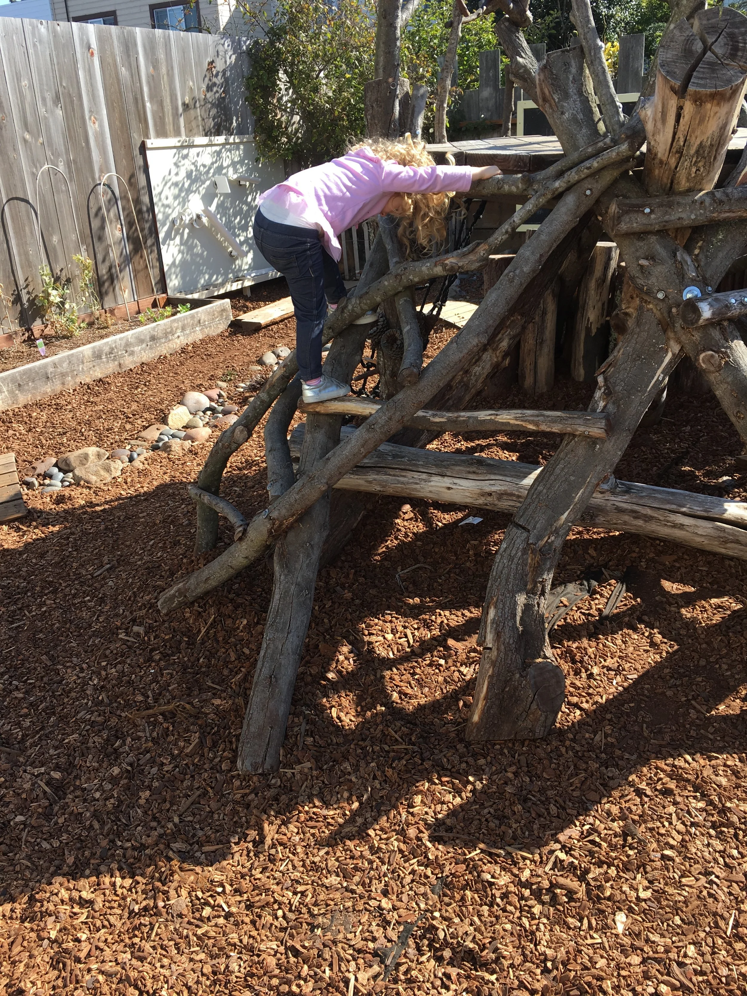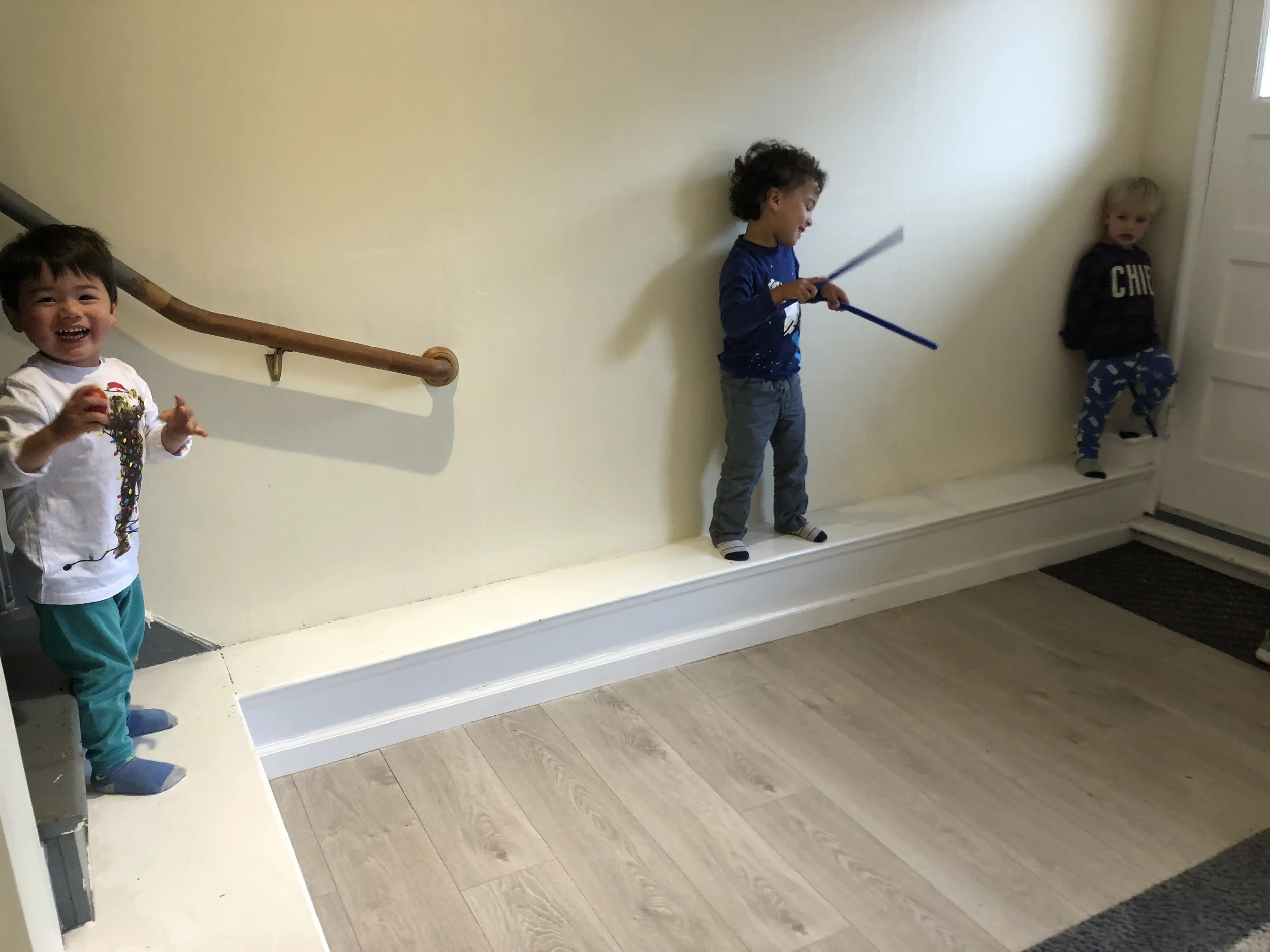 With our energetic bodies, we love climbing up and down the ladder and sliding down to the mattress, where we jump up and down and pretend to be monkeys. We also love rolling around with our friends on the mattress too! Every Friday, we have been practicing different yoga poses, including frog pose, spider pose, airplane pose, tree pose, and boat pose. One of our favorite poses is the down-dog pose!