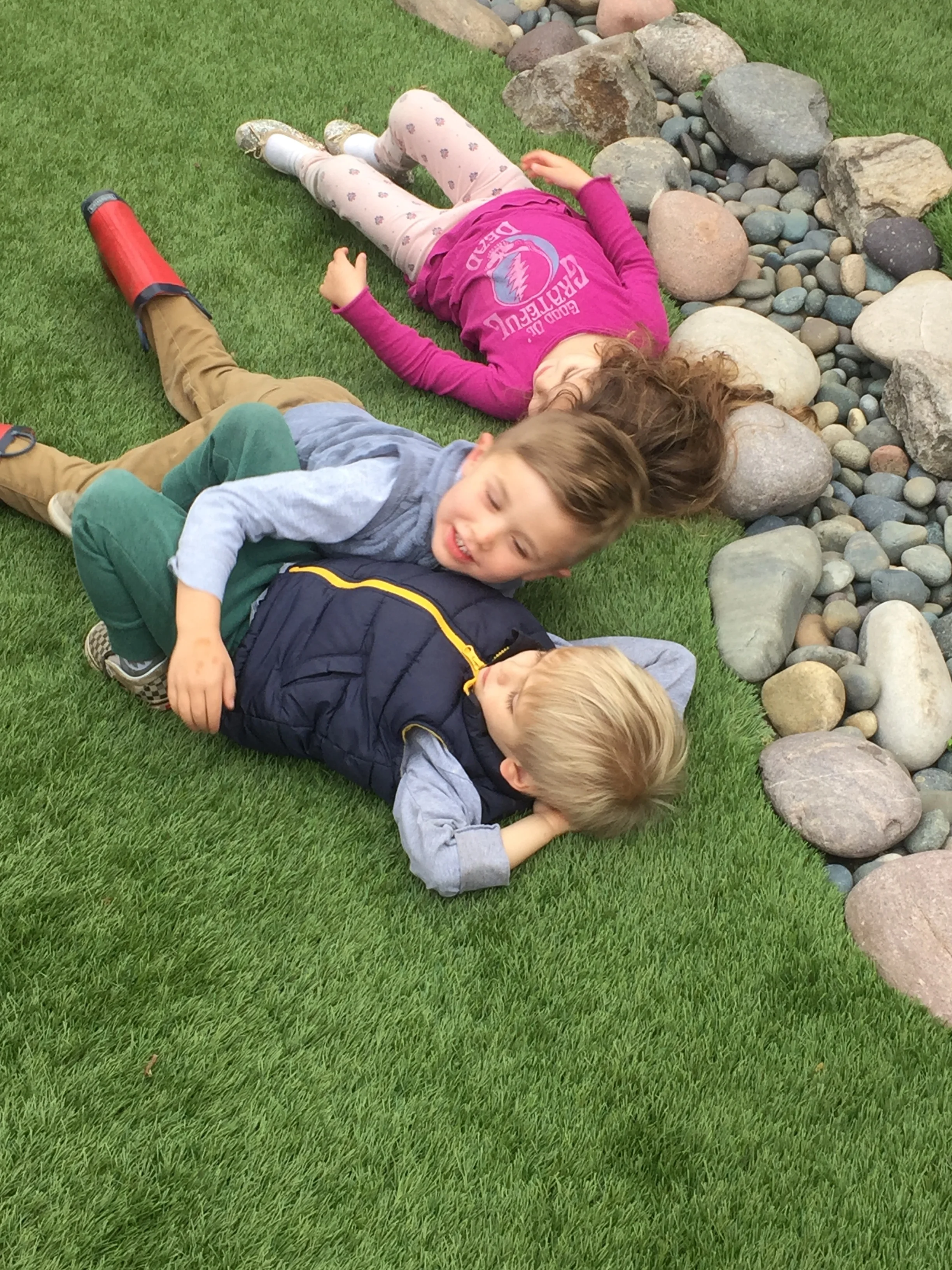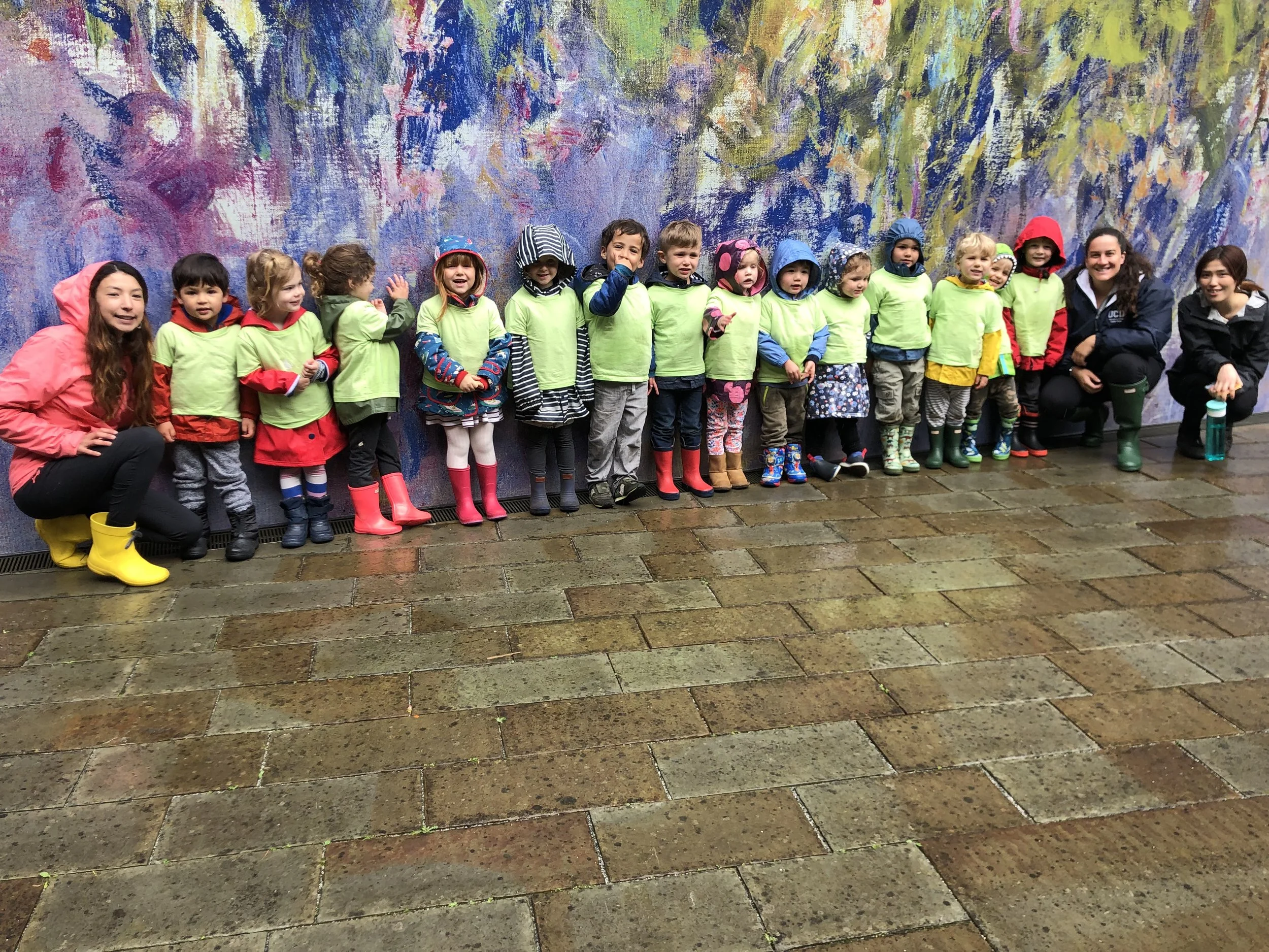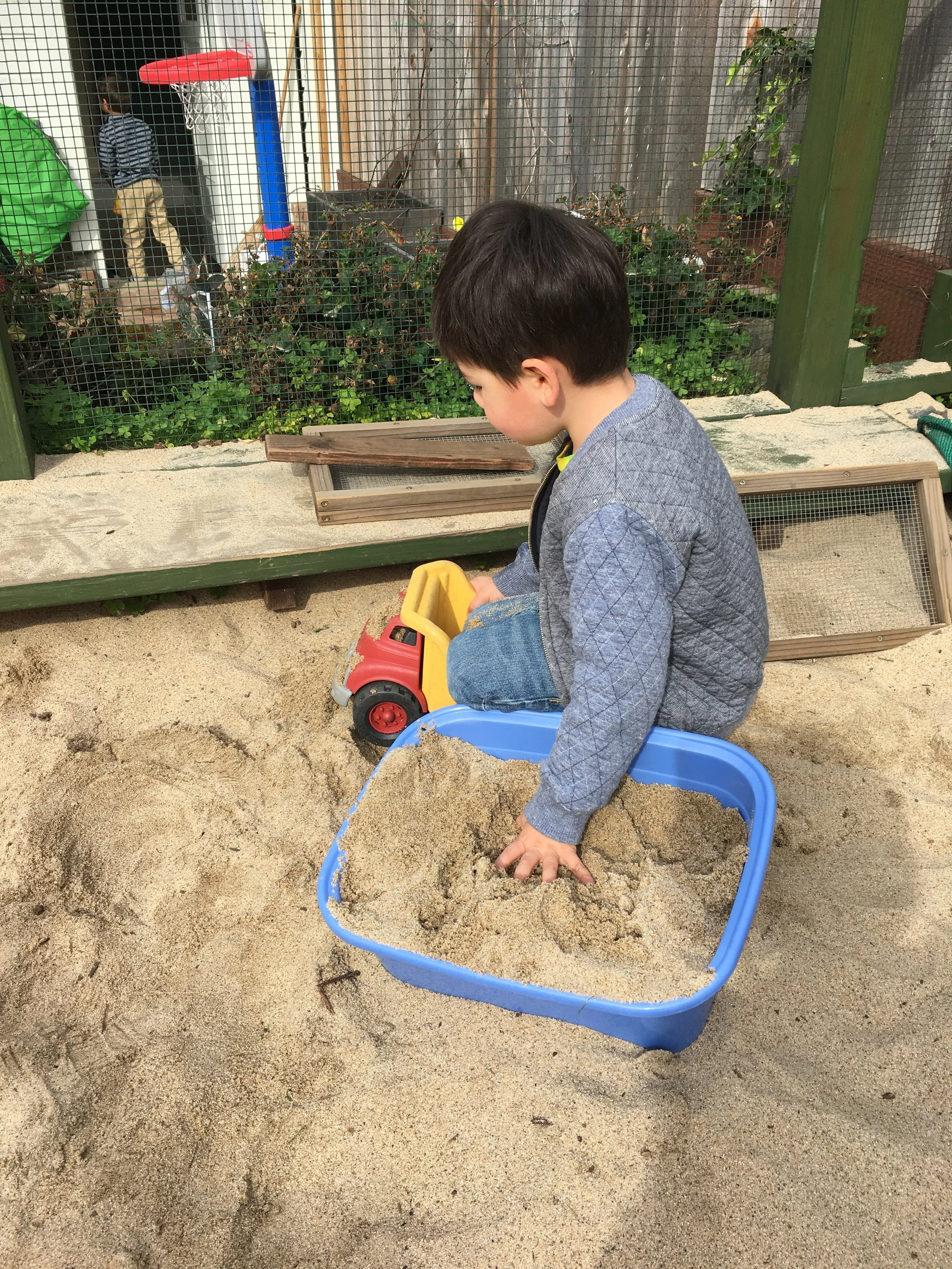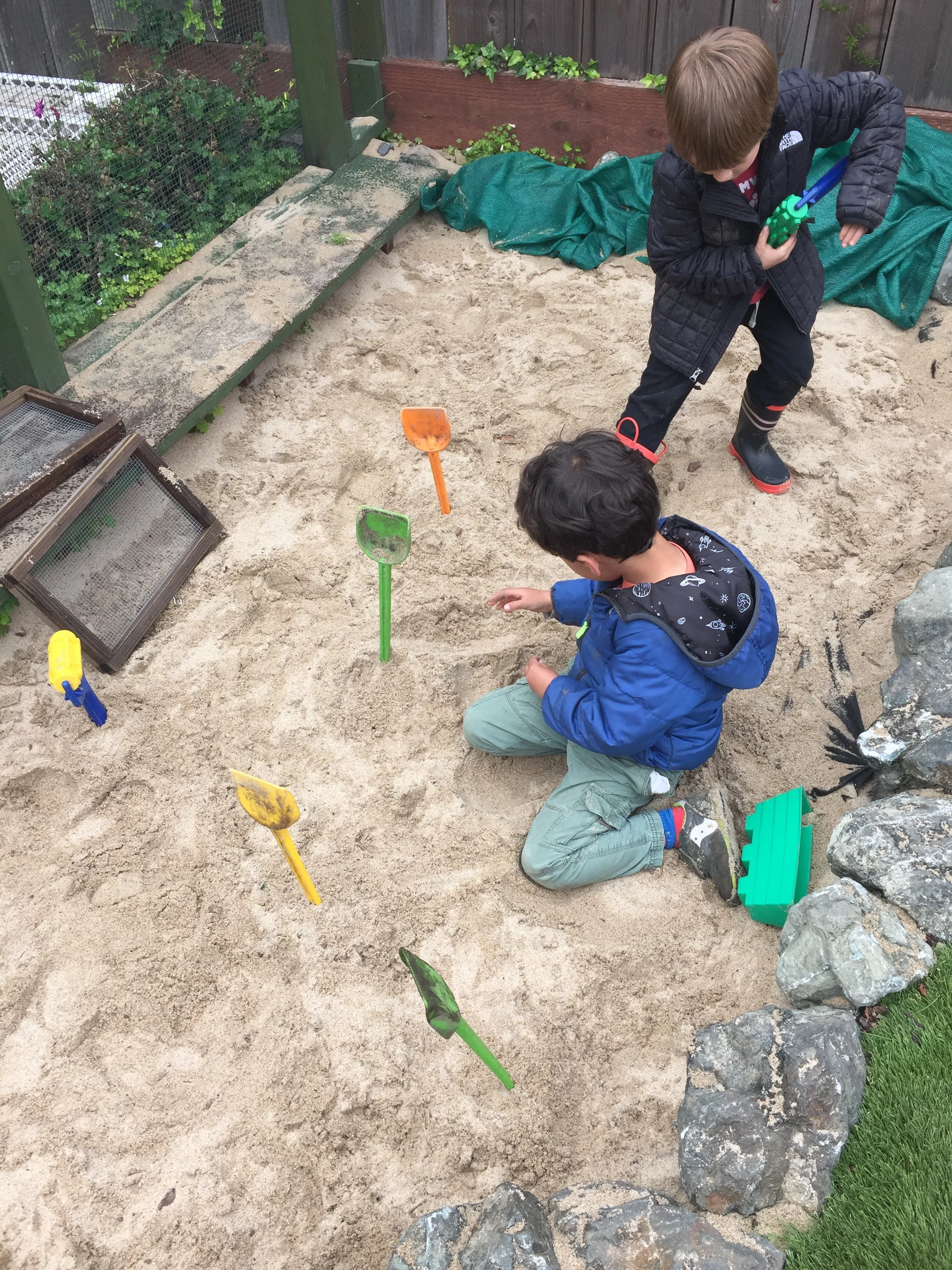 We’ve gone on two exciting art adventures with Teacher Edurne this month. First we attended the Monet exhibit at De Young, where we viewed his paintings of water lilies, gardens, and bridges. We were in awe at all the colors and details he included in his work and inspired to try to do the same in our own illustrations. On our second adventure, we visited the Legion of Honor, where we saw Auguste Rodin’s sculptures and had the opportunity to walk through the inside of a palace. We loved Rodin’s “The Thinker” and “The Clenched Hand” and tried to imitate these particular sculptures with our own bodies. The highlight of the trip, however, was seeing a real mummy in his coffin and drawing his tomb from our perspectives. Back at school, we have been enjoying creating treasure maps to take outside and loving playing in the spring garden themed sensory table.