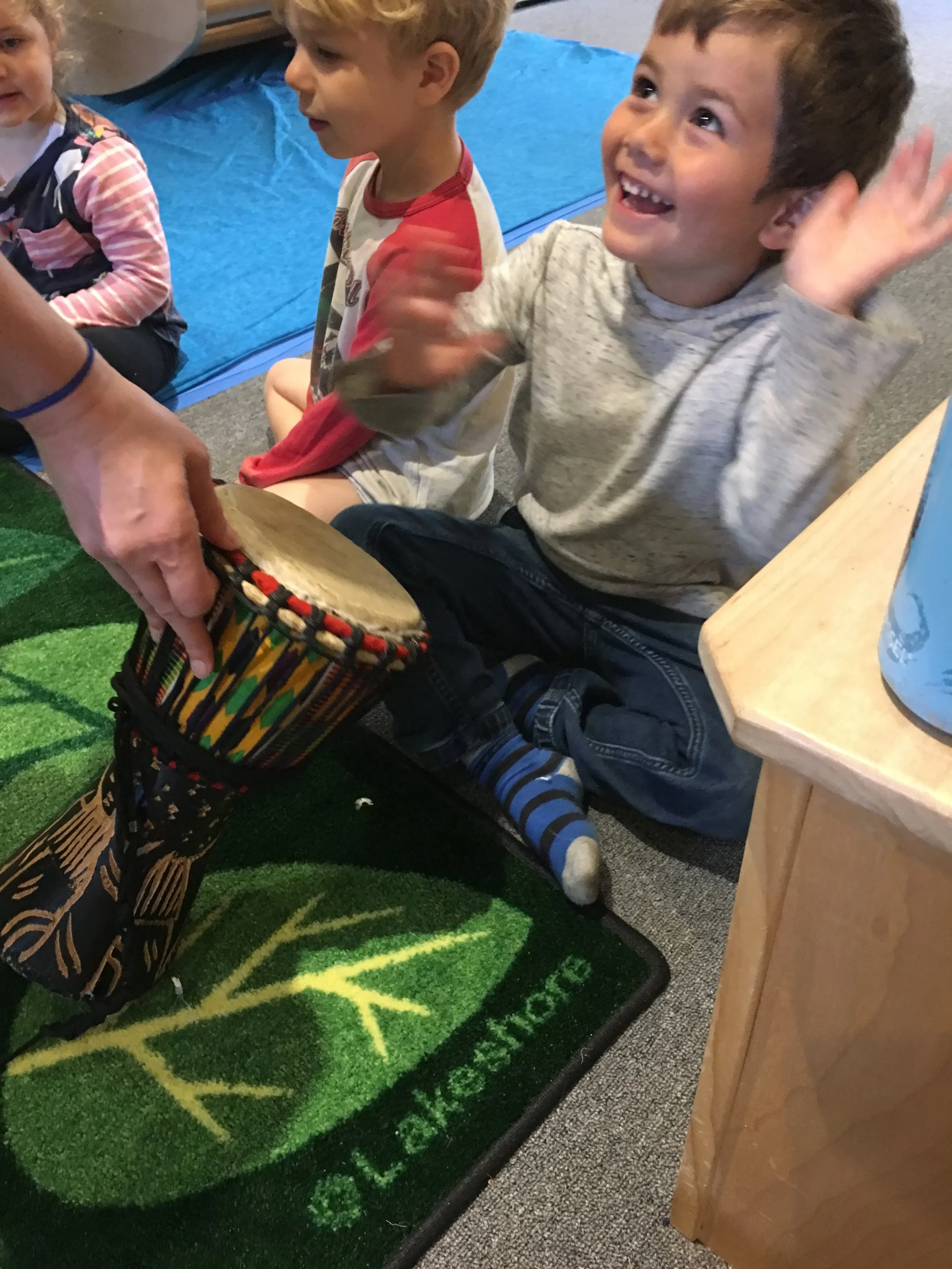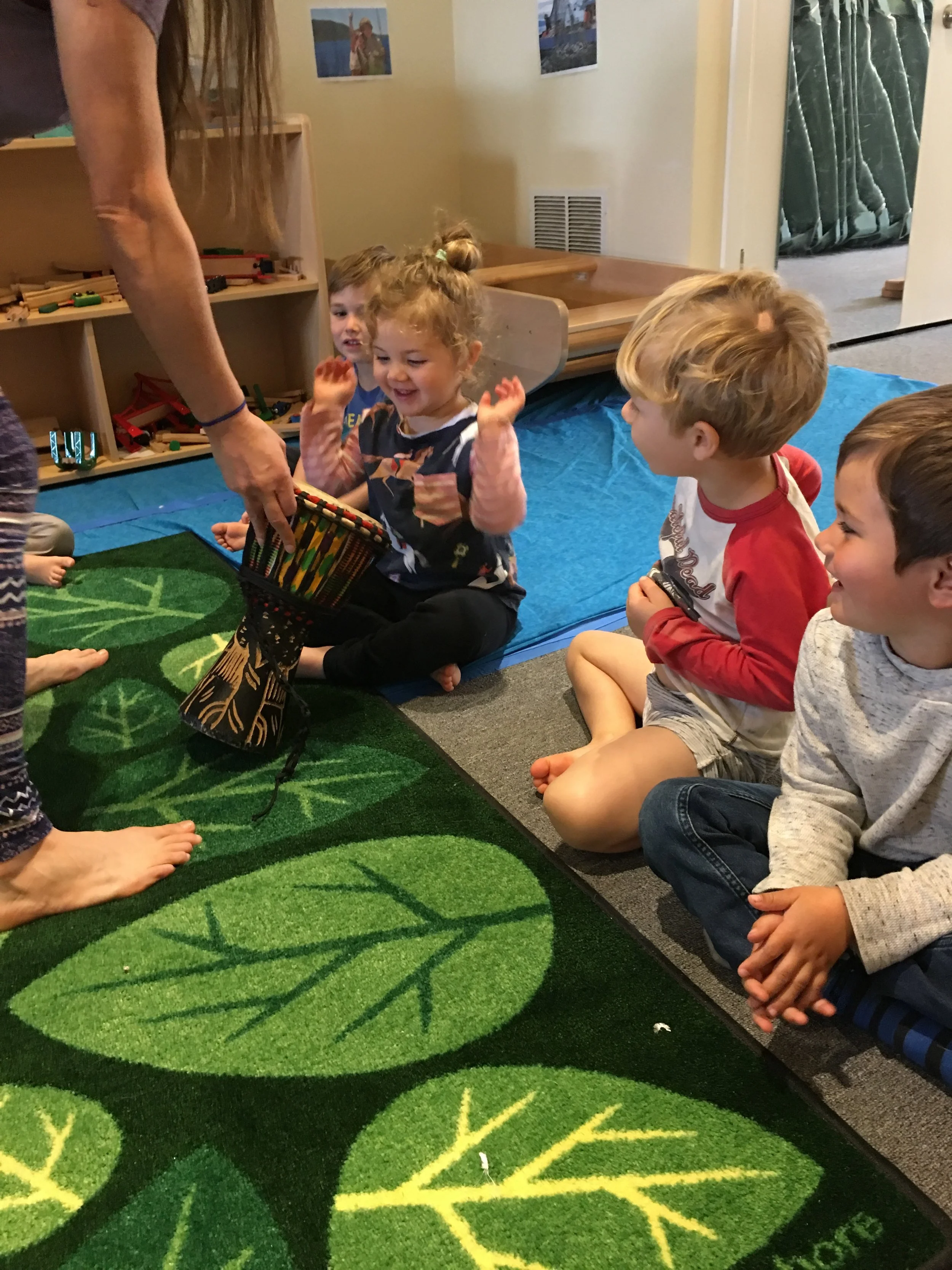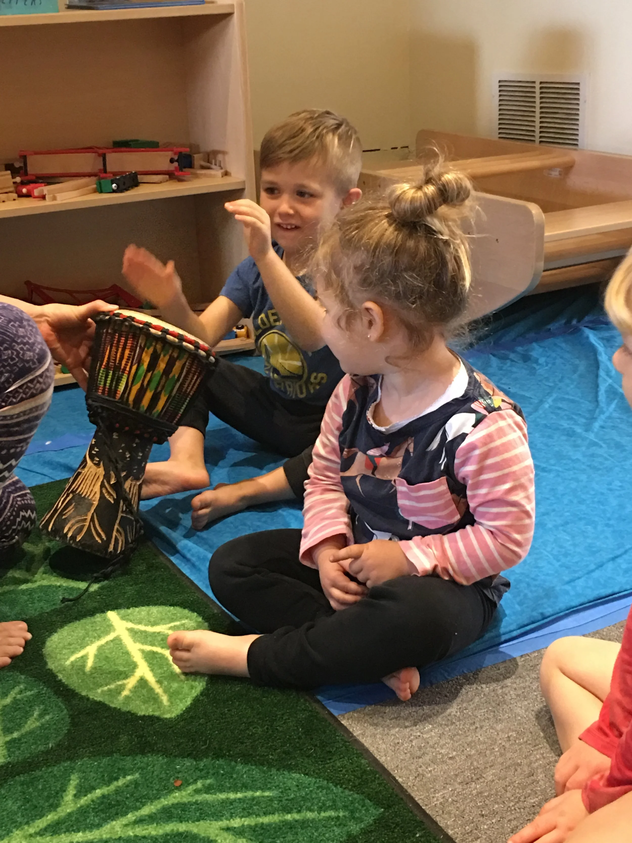 Our new balance beam has been so exciting and challenging. We like to see if we can get to the other side without falling. If we do make it across, it is so fun to jump onto the mattress. For yoga class, we have been practicing our favorite songs, “Black Dog in the River”, “Go Plane Go”, and a few others. Teacher Jesse also brought one of her special drums and let us play on it! It was so fun hearing the music we all created.