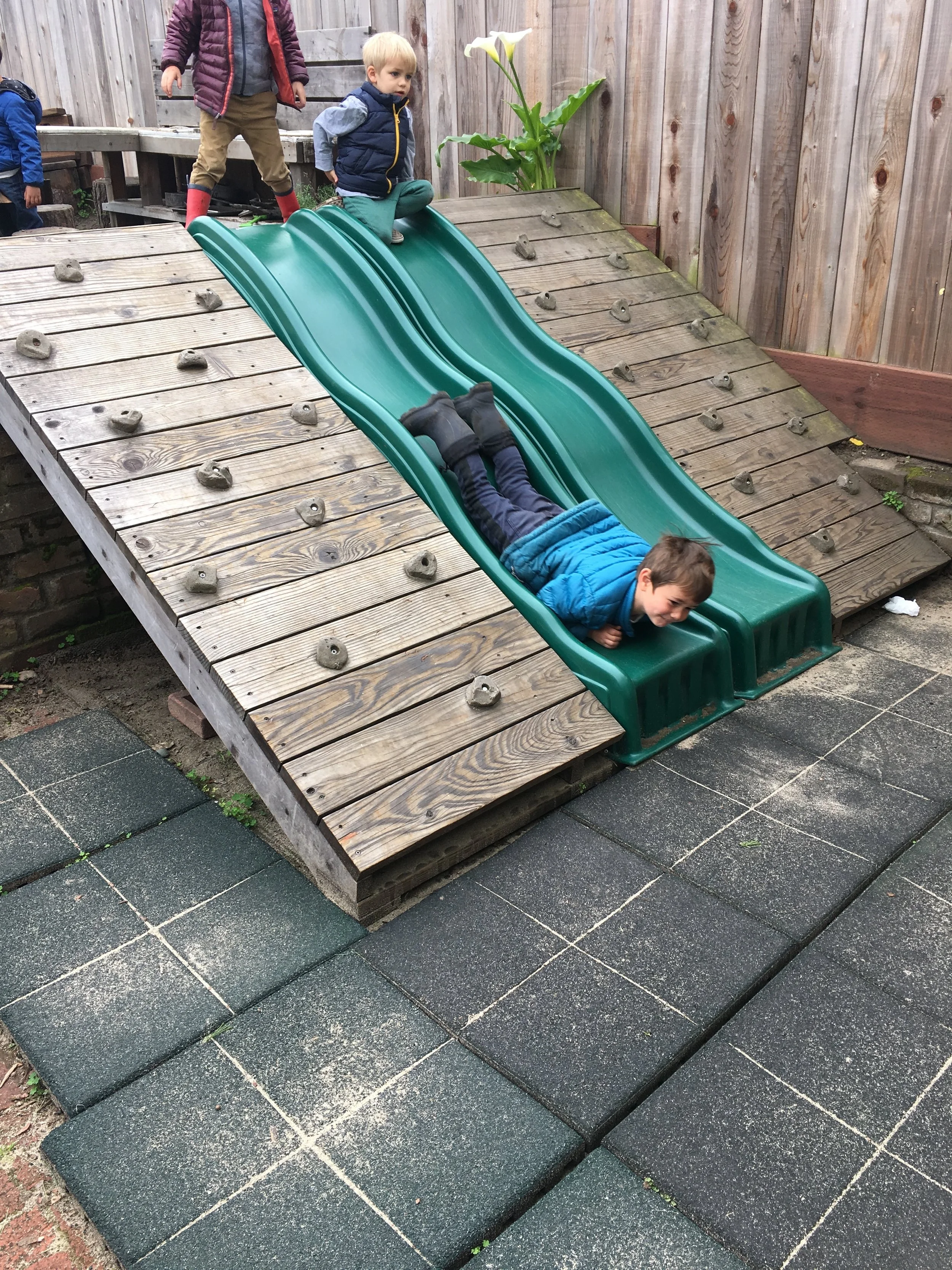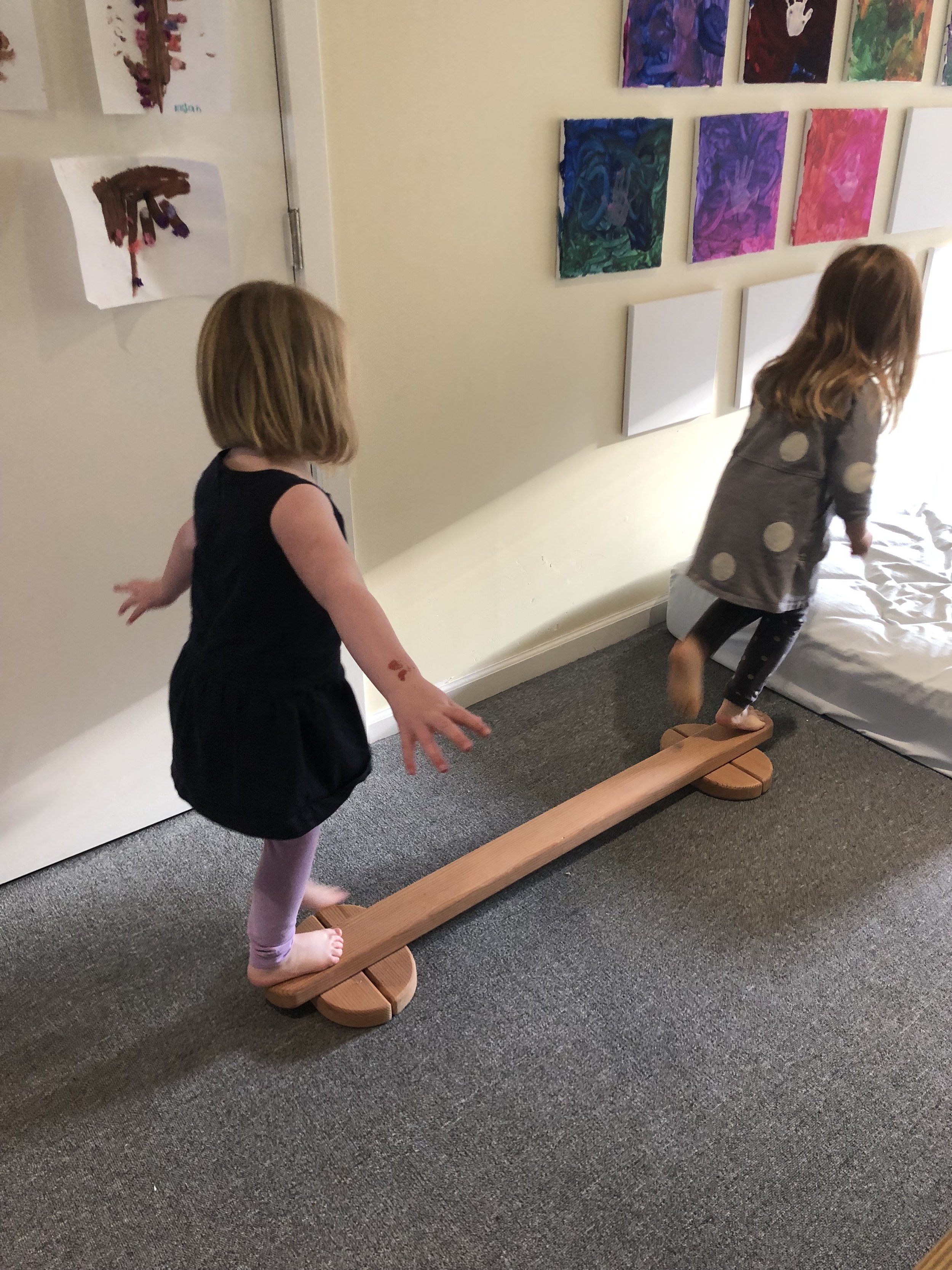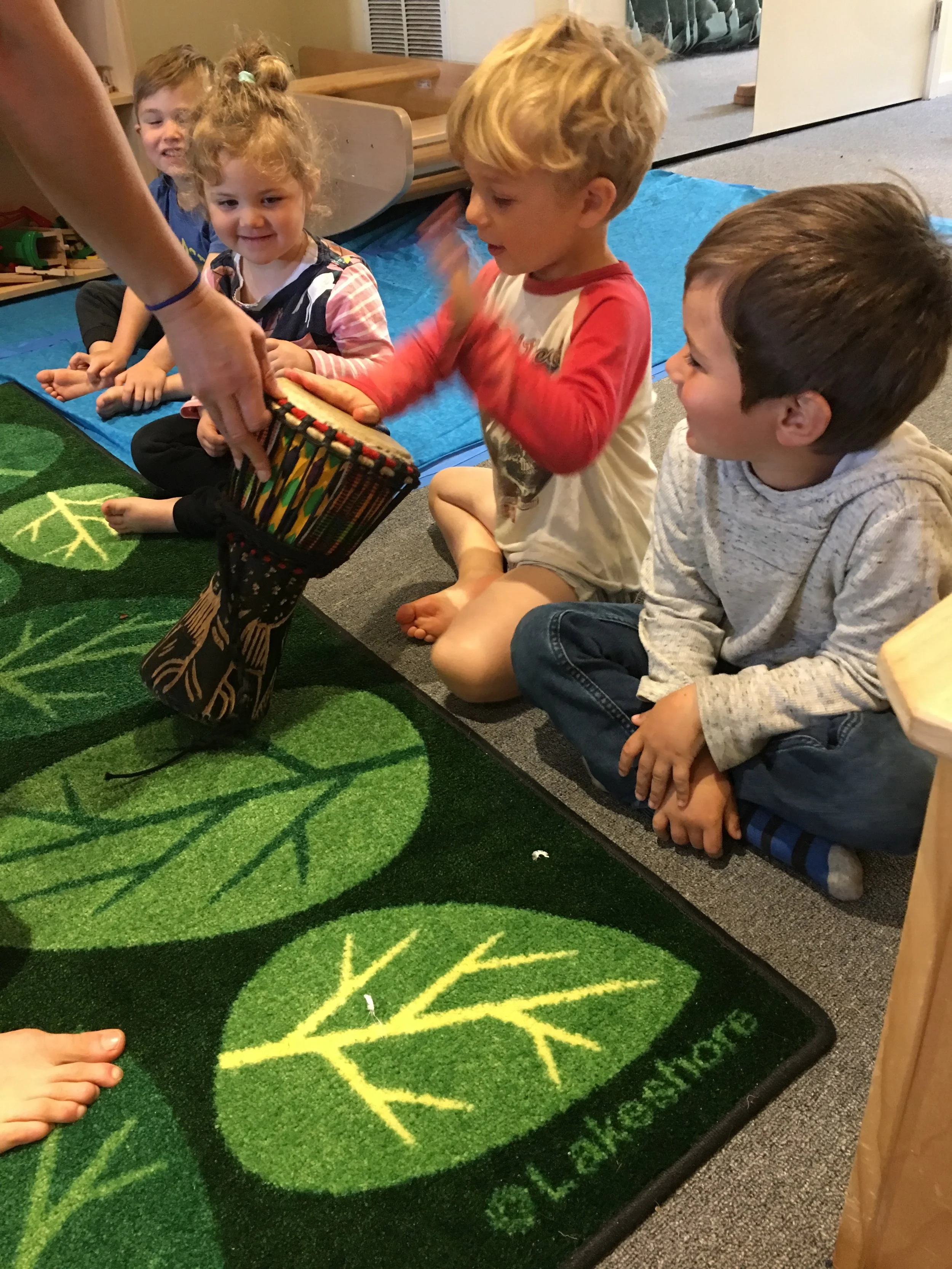 Our new balance beam has been so exciting and challenging. We like to see if we can get to the other side without falling. If we do make it across, it is so fun to jump onto the mattress. For yoga class, we have been practicing our favorite songs, “Black Dog in the River”, “Go Plane Go”, and a few others. Teacher Jesse also brought one of her special drums and let us play on it! It was so fun hearing the music we all created.