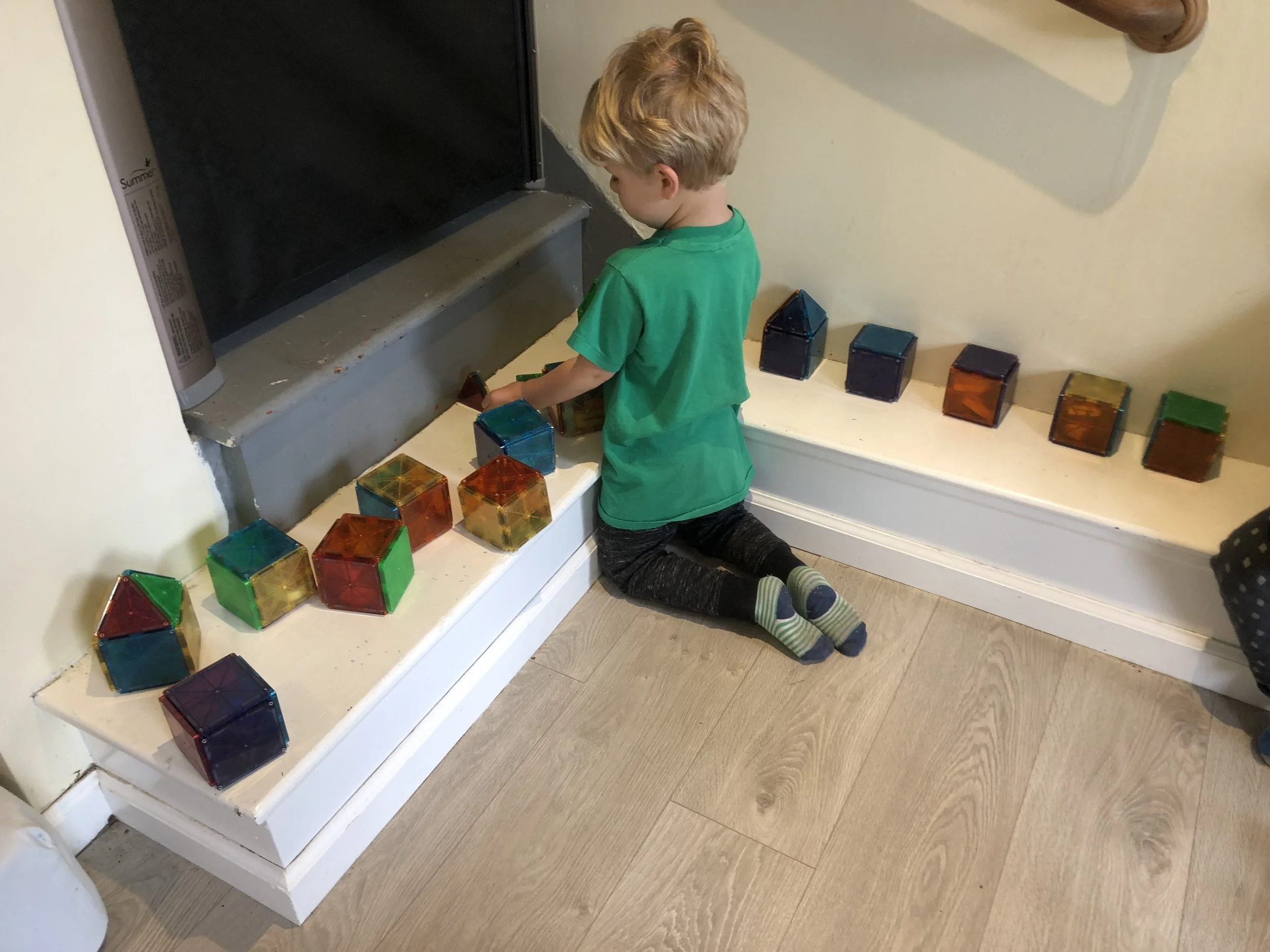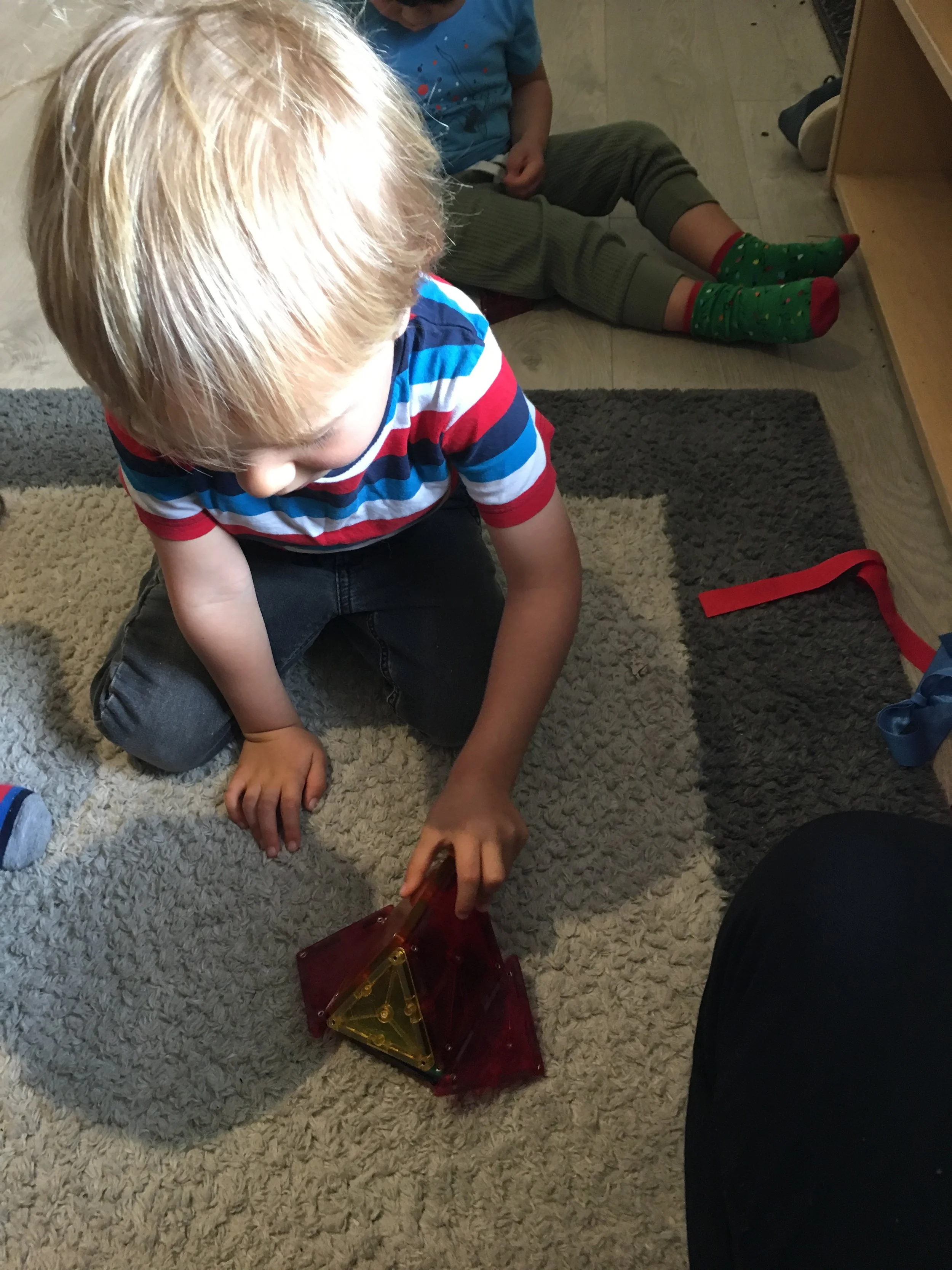 Lately, we have been practicing identifying letters with the alphabet board. When we want an extra challenge, we try to sound out words we know and arrange/spell them phonetically with the alphabet letters. At other times, we continue to find different ways to construct various objects using the Magna Tiles.